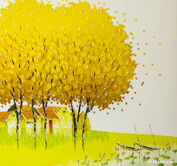 Original painting by Phan Thu Trang. The use of bright pastel colors and controlled spherical trees exudes a certain " cheerfulness " of her paintings. Trang 's elegant images of landscapes combined with the exclusive painting techniques have already raised the interest of international art collectors .