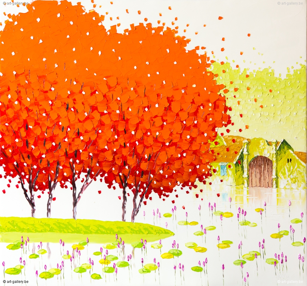 Original painting by Phan Thu Trang. The use of bright pastel colors and controlled spherical trees exudes a certain " cheerfulness " of her paintings. Trang 's elegant images of landscapes combined with the exclusive painting techniques have already raised the interest of international art collectors .
