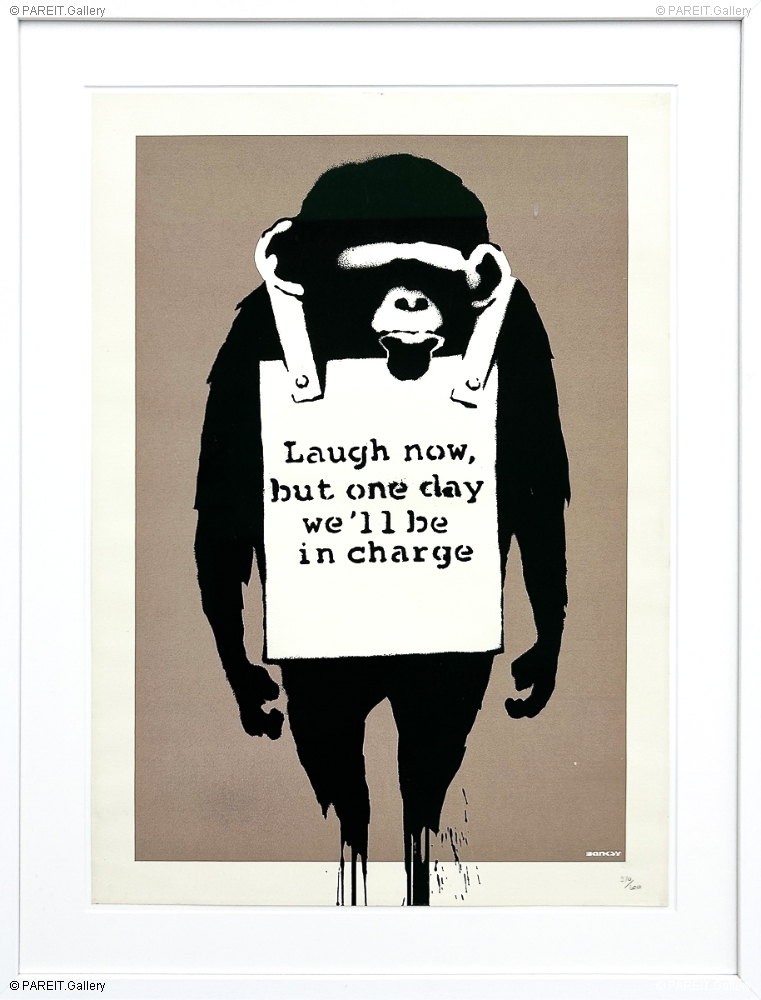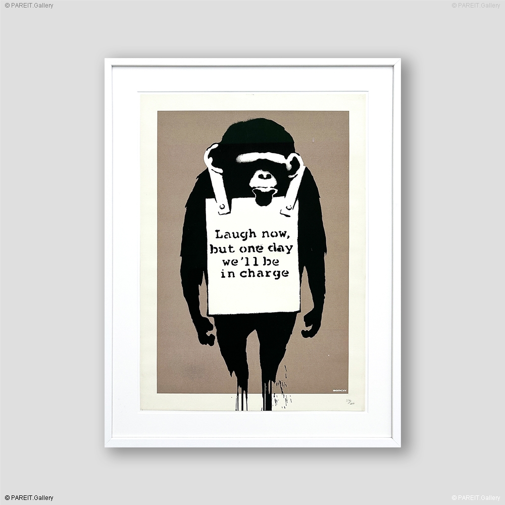 Laugh Now features a melancholic monkey, clad in a sandwich board that suggests its oppression or enslavement. The monkey, along with the rat, is one of Banksy's most recurring animal motifs, used to satirize human nature.