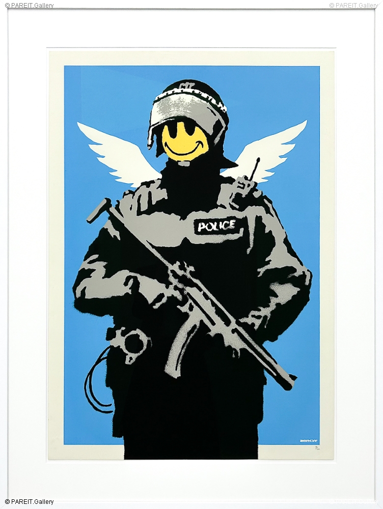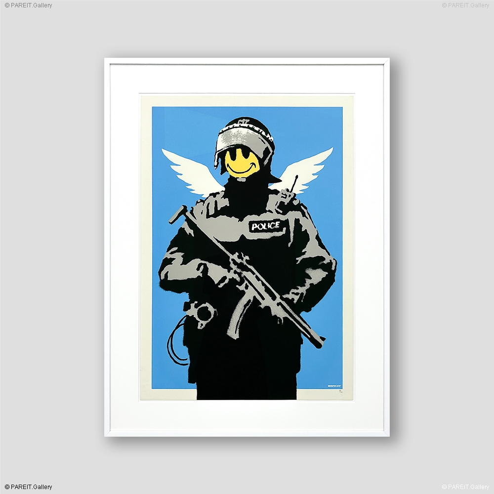 Flying Copper is one of Banksy's signature early works, depicting an armed police officer. The policeman stands tall, but instead of the usual stern expression, his face is replaced by a bold, yellow smiley - a symbol drawn from the 90s acid house culture, exuding a playful, almost childlike simplicity. This smiley is paired with a strikingly contrasting symbol of force: an assault rifle and full-body armor. Sprouting from his back are angel wings, creating an eerie and almost absurd combination.