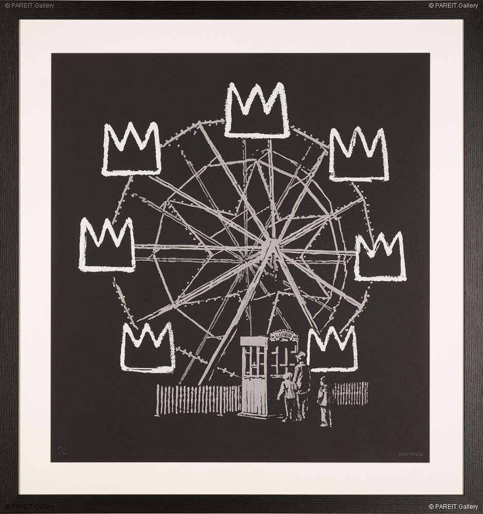 In Banksquiat, Banksy pays homage to Basquiat while simultaneously critiquing the pervasive cycle of capitalism and consumerism. The artwork depicts a Ferris wheel, with each carriage replaced by Basquiat's iconic crown motif, symbolizing how masterpieces are mass-produced and commodified.