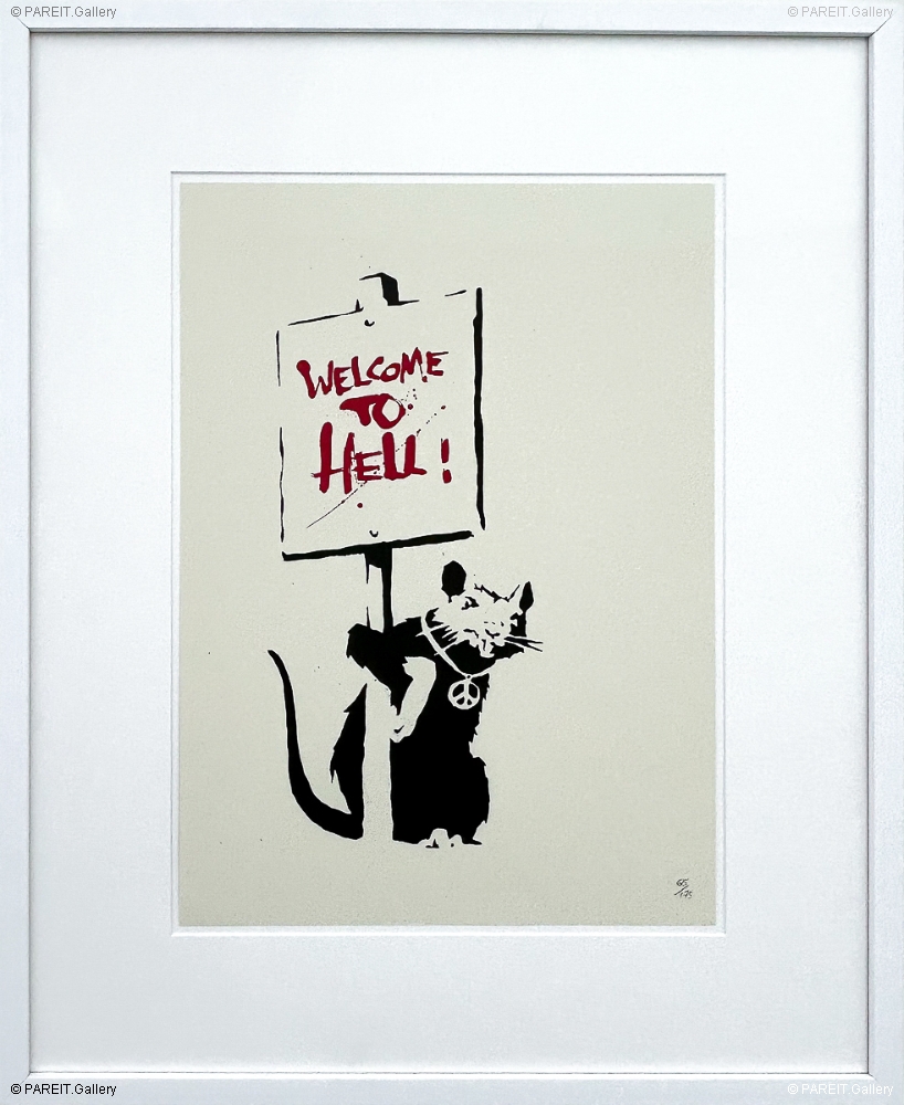 Welcome to Hell is one of the standout pieces in Banksy's Placard Rat series - a trilogy of screen prints released in 2004, each featuring the artist's iconic rat holding up a placard with the title of the work. The other two prints in this series are Get Out While You Can and Because I'm Worthless.