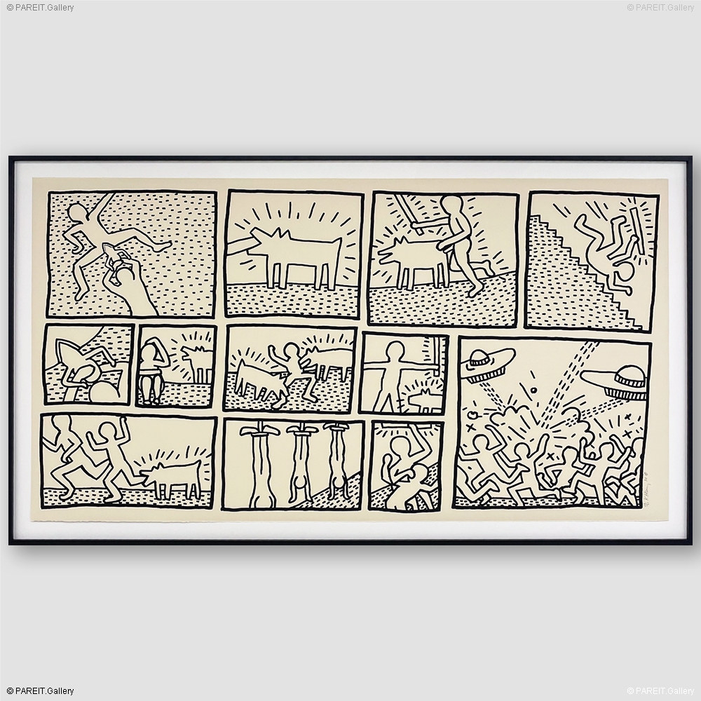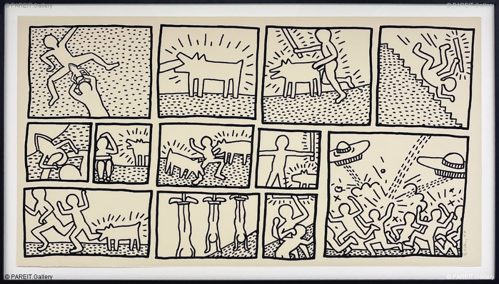 The panels are charged with tension - aggressive, dog-like creatures relentlessly pursue human figures. These dogs, a recurring motif in Haring's universe, stand as menacing emblems of authoritarian power. As the figures race, fall or cower in panic, the urgency of their flight intensifies; the jagged, frantic lines around the dogs and figures amplify this sense of fear and distress.