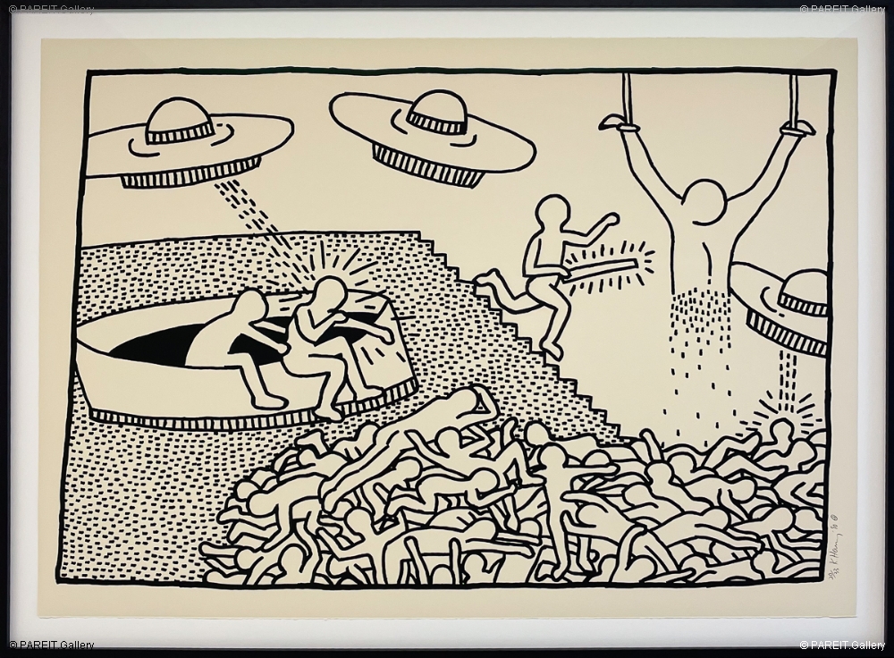 The Blueprint Drawings 2 is pure, raw intensity - Haring at his most haunting. Three looming UFOs hover over two figures desperately trying to escape a dark, abyss-like void. Throughout Haring's work, UFOs often represent higher forces - sometimes protective, sometimes foreboding. Here, they exude menace, their beams slicing through the scene like spotlights of control, isolation or an inevitable fate. The two central figures, scrambling to break free, stand in stark contrast to the chaos below. But can they truly escape? Their uncertain fate echoes the struggle of those who fought against societal oppression, only to be pulled back into its grasp.