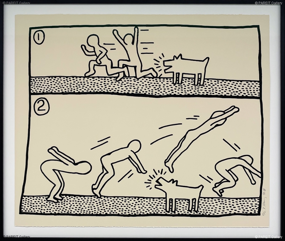 Haring's genius lay in his ability to craft a universal visual language, reminiscent of Egyptian hieroglyphics, rich with symbolism and layered meaning. The Blueprint Drawings 12 is no exception. The barking dog - one of his most iconic motifs - serves as a biting critique of power and corruption. Meanwhile, the dotted terrain subtly references the pervasive presence of the AIDS virus, a recurring theme in his later work. And still, the piece refuses to dictate a singular reading, leaving open the question: who holds power over whom in a society that is, whether literally or figuratively, infected?