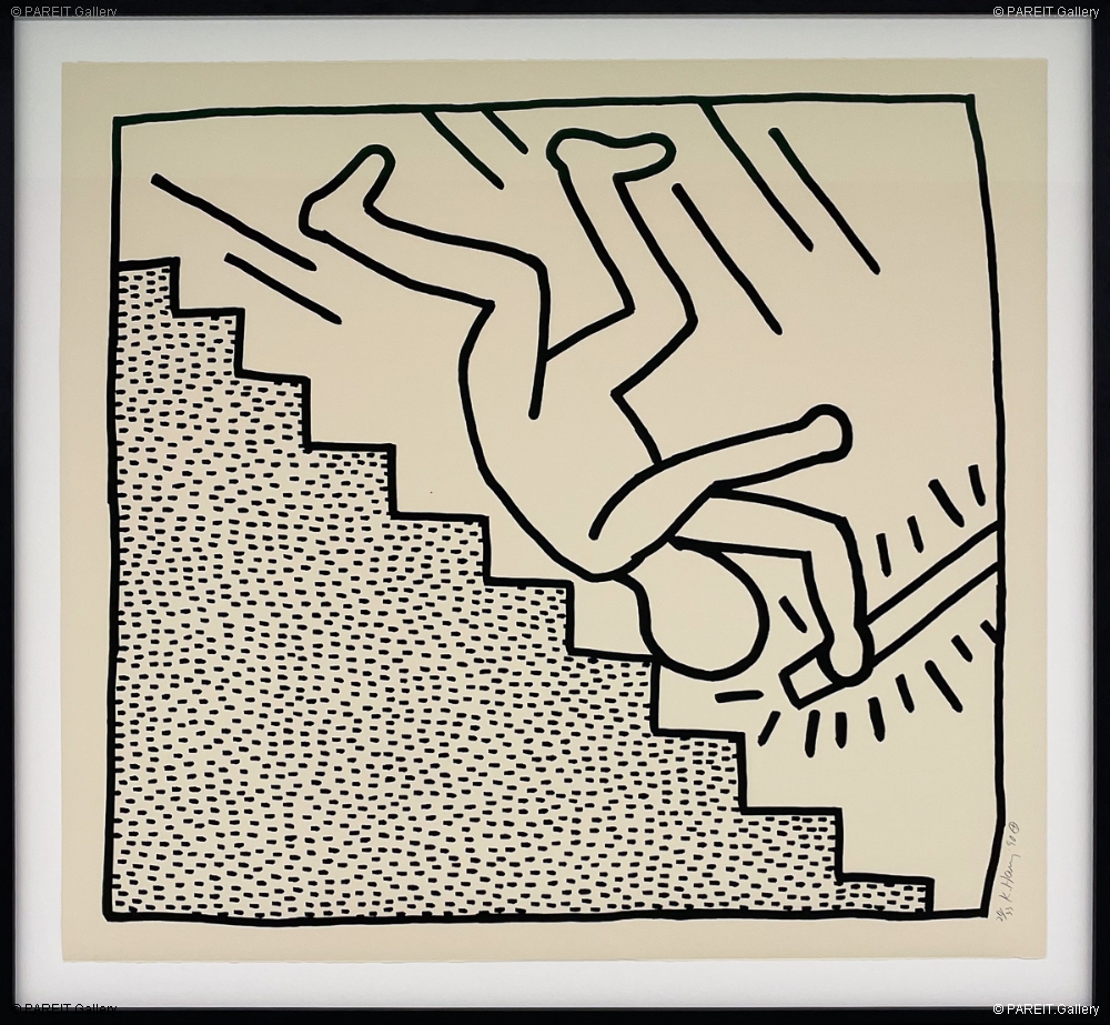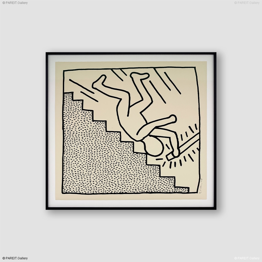 The Blueprint Drawings 16 is a raw, urgent and undeniably characteristic work by Haring. A faceless figure tumbles backward down a staircase, its body rigid yet weightless, frozen in a moment of forced descent. The assertive, motion-charged lines heighten the sense of expulsion - this is not merely a fall; it is a violent push, a loss of control, though the instigator remains ambiguous, shrouded in mystery.... In the figure's grasp lies a radiant rod, a recurring motif within the Blueprint series. Here, it shifts once more between meanings - signifying both power and agency on one hand, and a piercing, deadly force on the other.