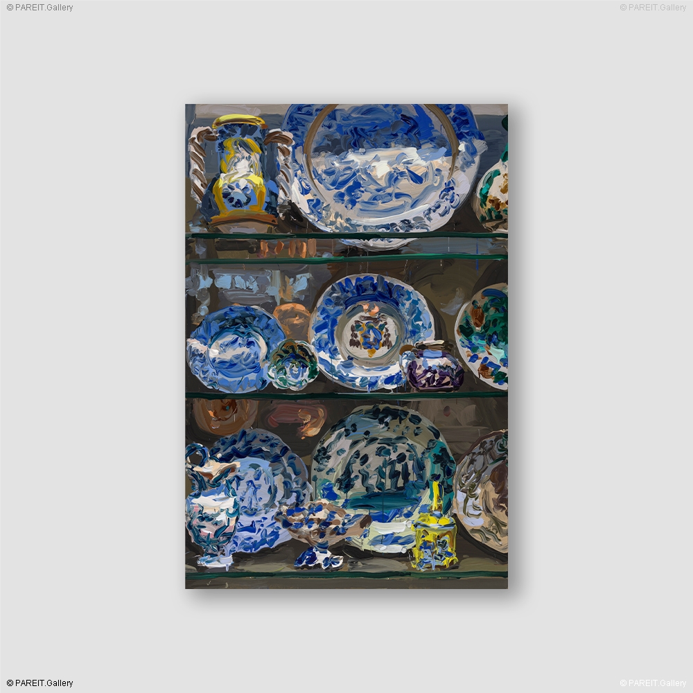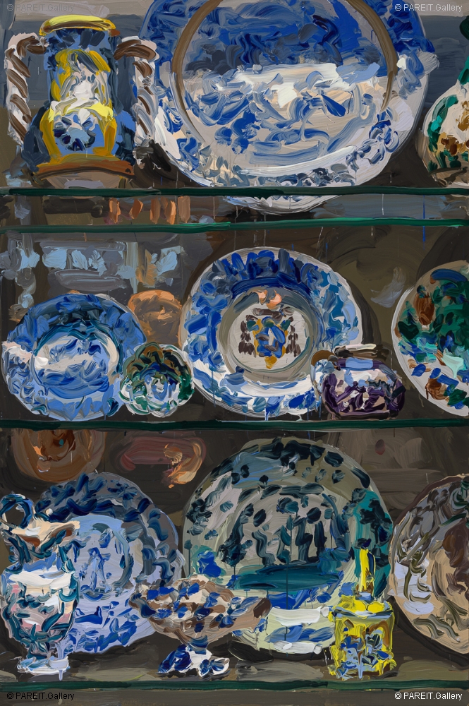 Refined antique objects carry a quiet luxury -memories of a time when beauty, status, and refinement effortlessly went hand in hand. This vanished splendour has intrigued Jan De Vliegher for years and serves as the starting point for his "Treasury" series. In each painting, we see a display cabinet filled with porcelain: platters, plates, cups. What once stood still and fragile behind glass becomes, under De Vliegher's brush, a sensory experience -powerful, colorful, intense. The image seems to draw the viewer inside the cabinet, revealing a depth of shine, movement, and pure paint. De Vliegher does not choose a literal depiction but an evocation. Ornaments and tableware are reduced to their essence -memory and desire. The series was first exhibited in 2011 at Gaasbeek Castle and originated from a visit to the Victoria & Albert Museum in London. Today, so many years later, "Treasury" continues to evolve -a lively conversation between past and present, between viewing and deep experience.