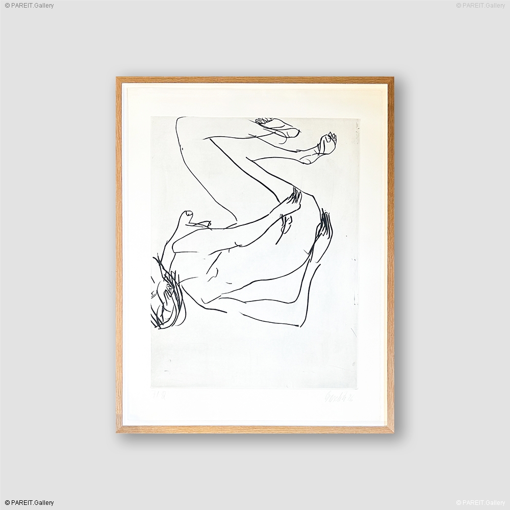 The etching "Schlafende Frau" (Sleeping Woman) by Georg Baselitz is a work that fits within his graphic oeuvre, in which he frequently experiments with form, line, and technique to enhance his expressive visual language.
