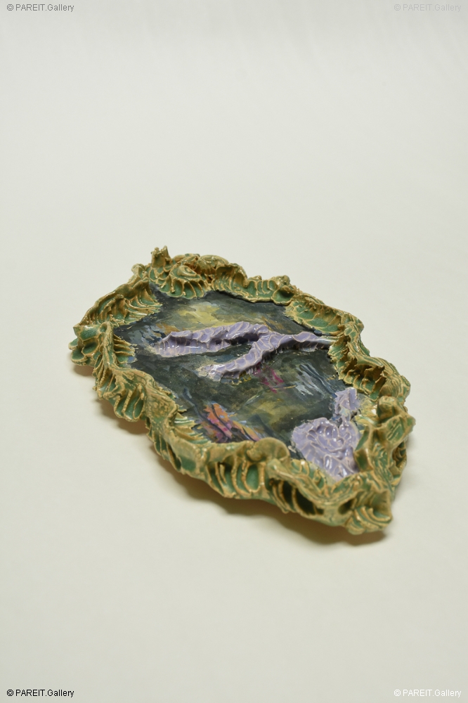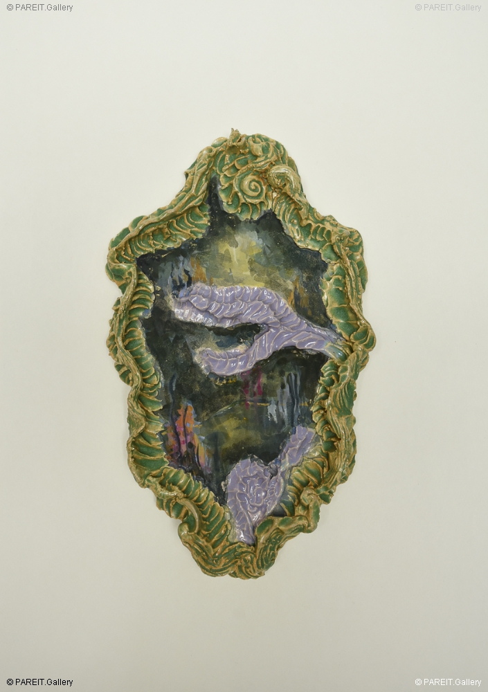 Extra info: This ceramic work, inspired by the artist's personal memories - often vague moments from long ago or dreams - combines delicate brushstrokes with a poetic sensibility. Its exceptional, eccentric framing echoes the ornamental richness of Rococo, a style that fully embraced beauty, playfulness, and detail. Flowing shapes, soft colors, and intricate patterns create an emotional and expressive experience, like visual poetry. Some elements are more tangible than others, adding an extra, tactile layer to the experience. Small "resting spots" invite the viewer to place something, literally or figuratively, within the work, transforming it into an object that transports one back into the realm of memory.