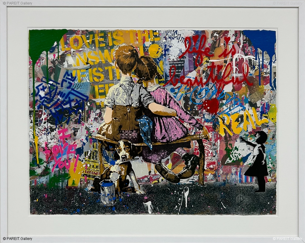 Silkscreen and mixed media on paper. This artwork is professionally framed in a white frame with UV-protective glass - ready to hang and enjoy.