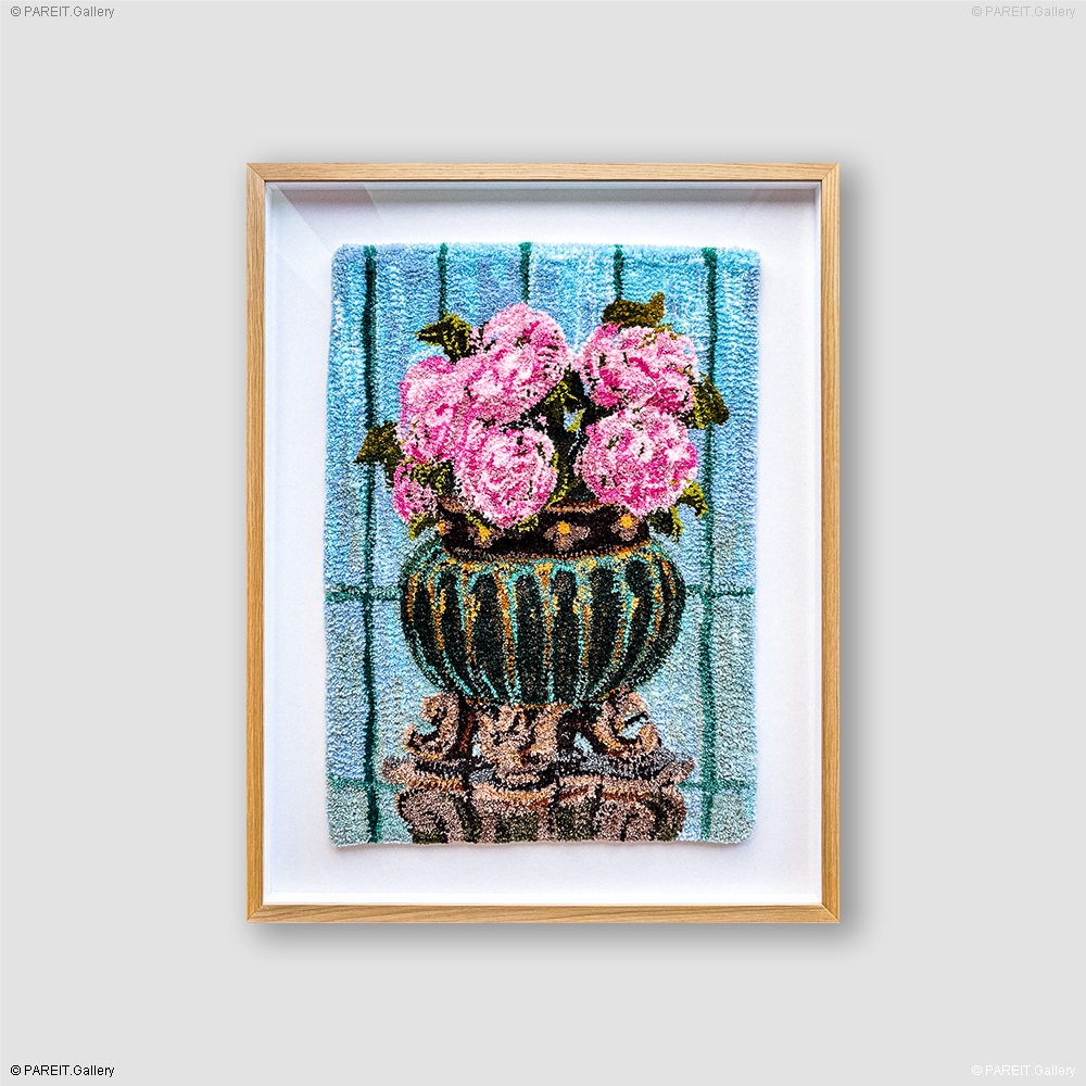 Original, multicoloured and handcrafted tapestry. This striking piece of precision craftsmanship is elegantly framed in wood with UV-protective glass. The work is part of the series "Serres Royales Laeken", specially created by the artist for the exhibition "Bloom" (2025).