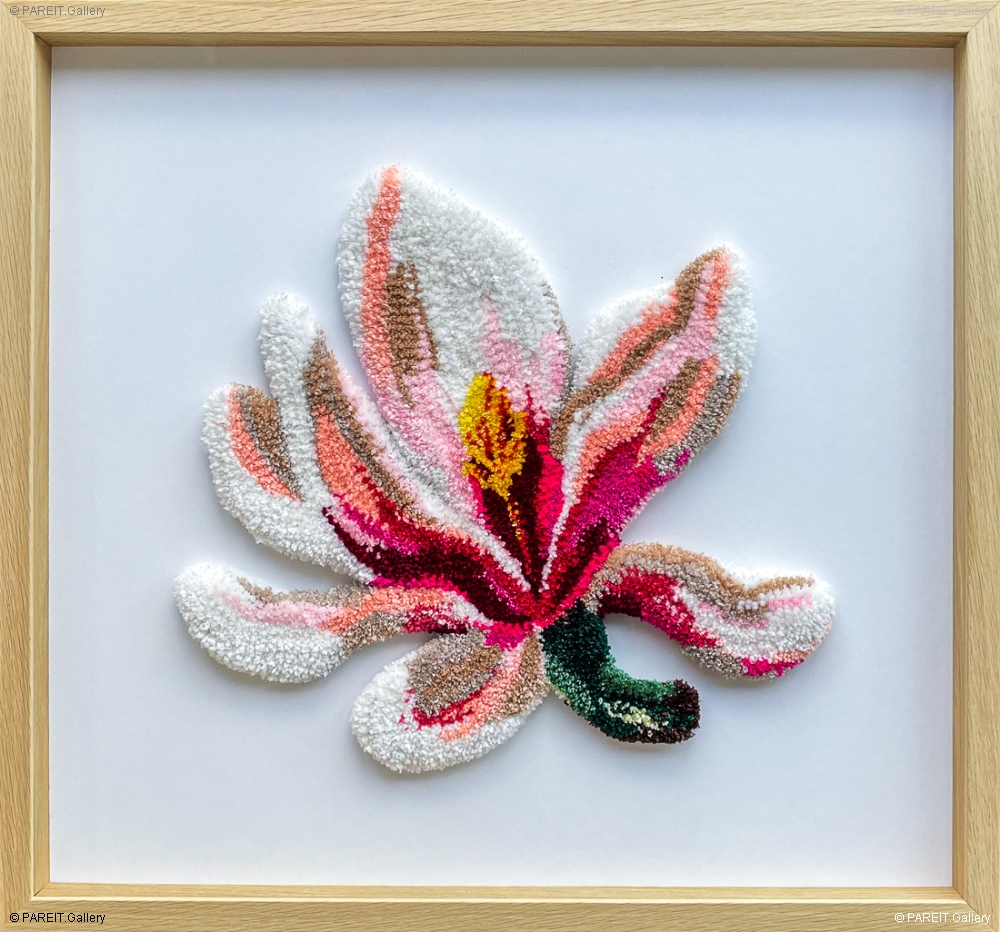Original, handcrafted tapestry. In this refined piece of craftsmanship, executed with precision and meticulous attention to detail, a blooming interplay of texture and colour unfolds. The work is elegantly framed in wood with UV-protective glass and forms part of the "Magnolia" series, specially created by the artist for the exhibition "Bloom" (2025).