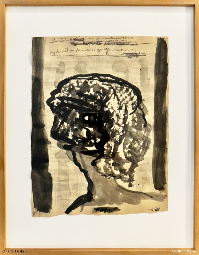 Pencil and ink work on brown paper. Signed with the artist's initials and dated "MD '88" (lower right); titled "Die luukse probleme van de kunstenaarskap populariteit + Achtervolgingswaanzin" (along the upper edge); inscribed "Face" (lower centre). This unique work is offered in a wooden frame.