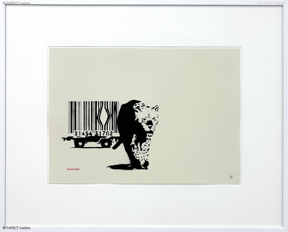 Barcode Leopard, représente un léopard audacieux et intrépide qui semble tout juste s'être échappé de sa cage, devenu un code-barres sur roues. À première vue, cette impression frappante peut être interprétée comme une critique de l'exploitation des animaux par l'homme à des fins de divertissement, comme on le voit dans les zoos et les parcs marins. Banksy nous sensibilise au commerce illégal des animaux sauvages, notamment le braconnage des grands félins pour leur fourrure, et leur captivité - qu'elle soit pour le plaisir privé ou pour l'exposition publique dans les zoos.