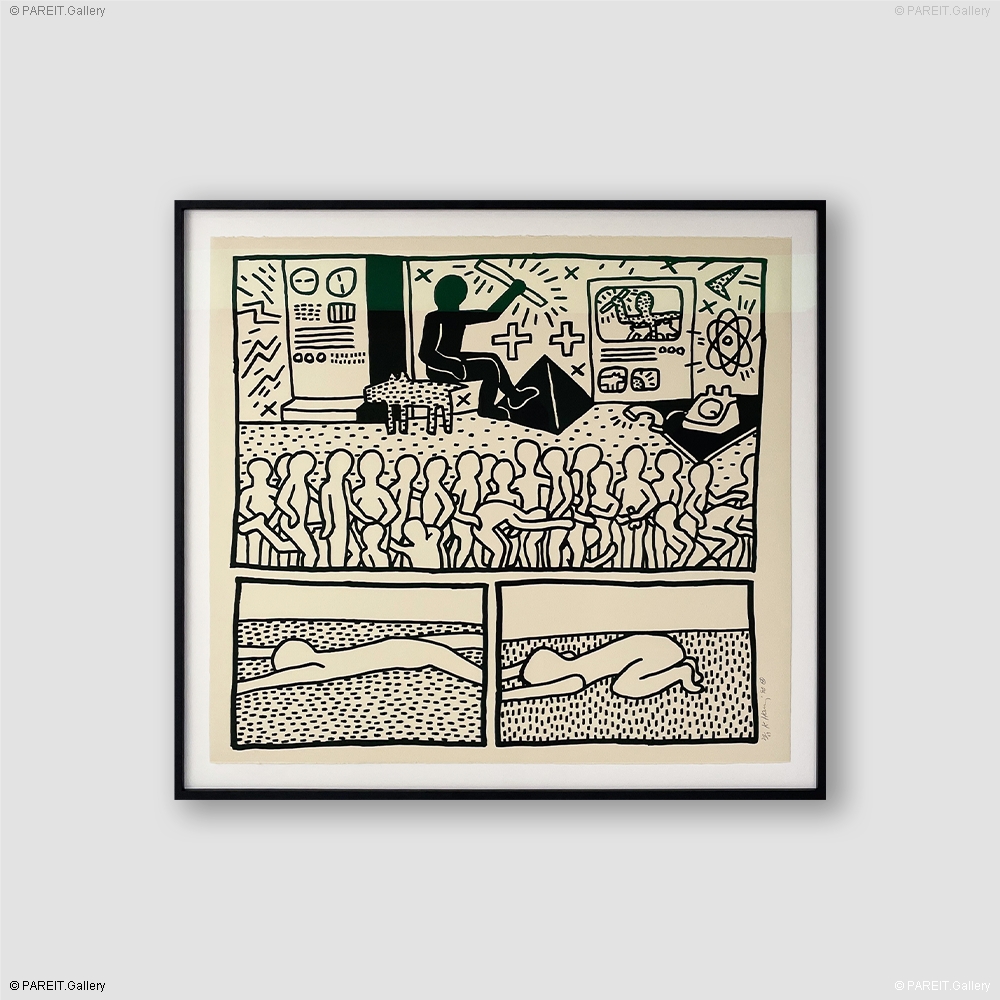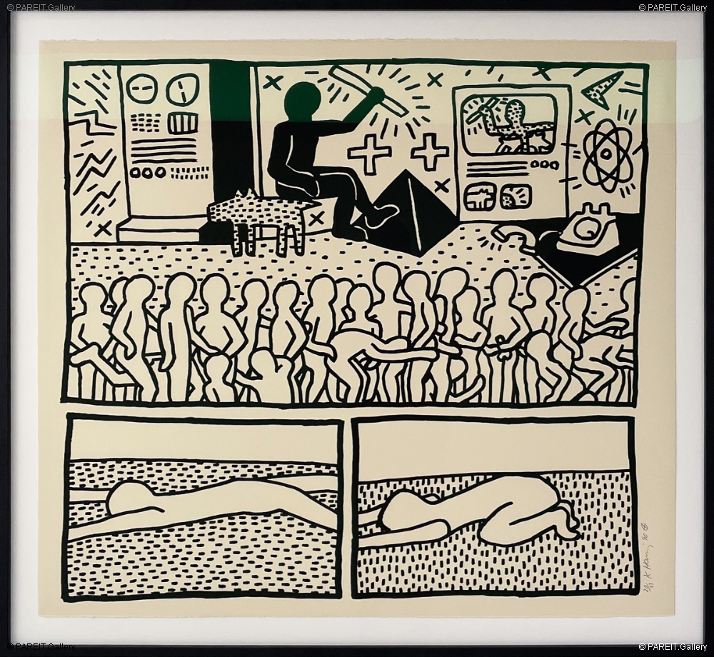 Dans le deuxième panneau (en bas à droite), une figure sans visage commence à s'effondrer, une manifestation physique de soumission, d'impuissance et de perte d'identité face à des forces insurmontables. L'anonymat de la figure la transforme en un symbole, non pas d'un individu, mais de l'abandon social. Dans le dernier panneau, la figure gît sans vie sur le sol, frappée par l'oppression, la maladie et/ou la violence. C'est un point culminant tragique qui reflète le mépris institutionnel de la vie, réduisant les personnes à de simples statistiques au lieu de les reconnaître comme des êtres humains. Avec cela, Haring nous confronte à la vérité inévitable de la négligence, de l'oppression et de l'effacement des vies en temps de crise.