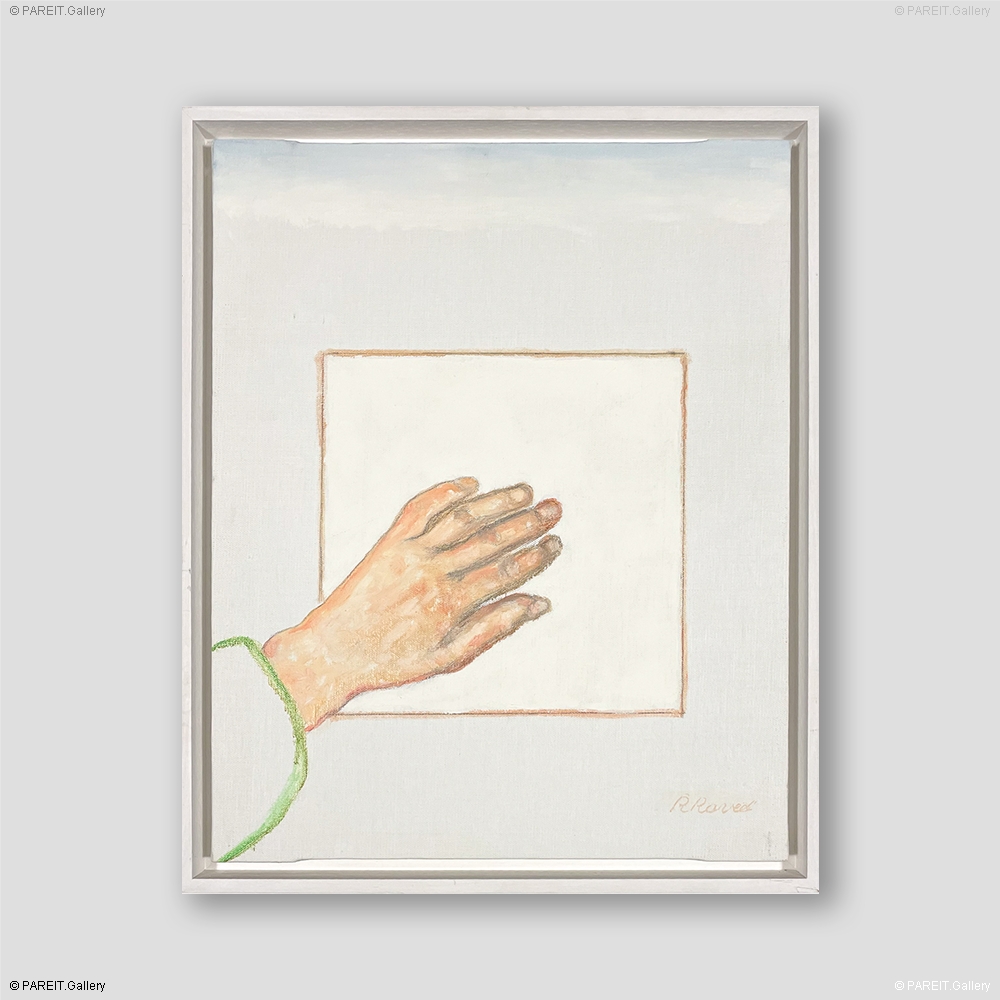 Dans " Hand ", Roger Raveel présente un motif unique et puissant : une main humaine qui s'étend à partir d'un bras partiellement visible et semble entrer en contact avec une surface blanche - cet élément réfléchissant si caractéristique de son oeuvre. La composition est simple, presque minimaliste, mais porte une charge symbolique profonde. Comme souvent chez Raveel, la main évoque plusieurs significations possibles. Peut-être est-ce la main de l'artiste lui-même : l'instrument avec lequel il a créé, pensé et touché toute une vie durant. Peut-être est-ce la main de l'autre - un souvenir de proximité, un geste de lien. Dans sa simplicité abstraite, la main devient une image à la fois personnelle et universelle, tangible et spirituelle. L'oeuvre s'inscrit dans la dernière période de Raveel, marquée par la sobriété, la stylisation et la contemplation. Son langage visuel se réduit à l'essentiel : espace blanc, géométrie et symbolisme. À ce stade, Raveel ne réfléchit plus uniquement au monde visible, mais interroge la relation entre matière et esprit, entre absence et présence.