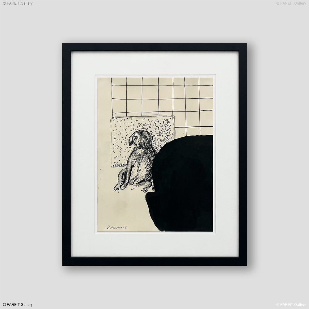 Une tête humaine, méconnaissable et seulement partiellement représentée - un motif récurrent dans son oeuvre - semble regarder un chien,