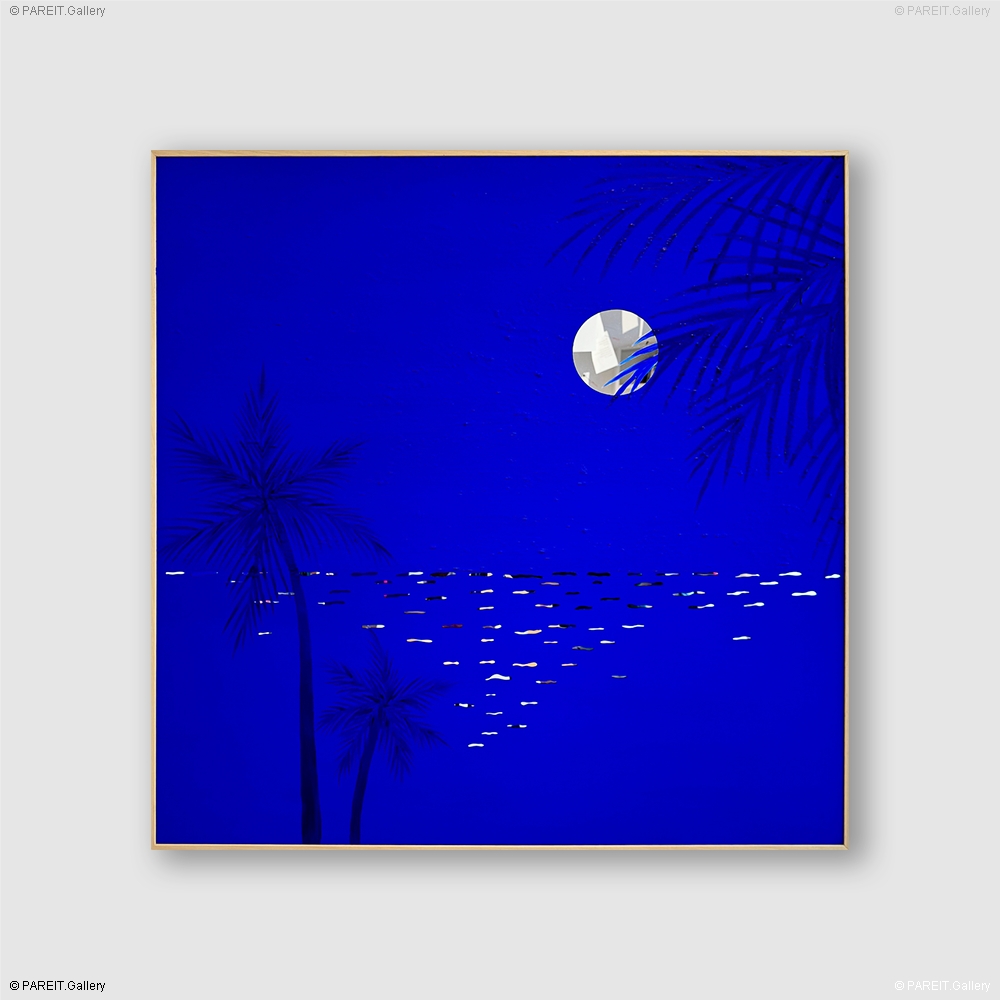 Info complémentaires: Cette oeuvre fait partie de la série Summer Nights (2025), dans laquelle l'artiste explore des compositions bichromes sur une surface réfléchissante. La série repose sur deux couleurs, dominées par un bleu profond et intensément pigmenté, inspiré du célèbre bleu d'Yves Klein.
