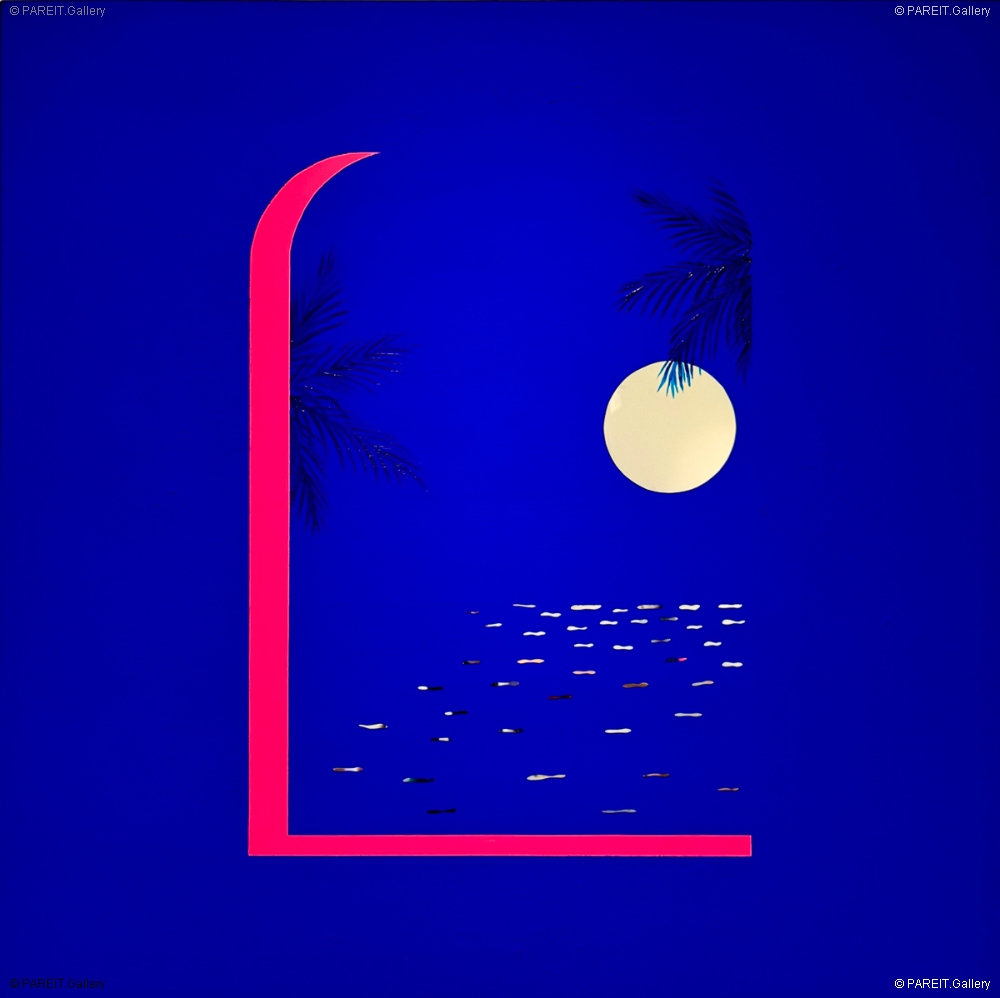 Cette oeuvre fait partie de la série Summer Nights (2025), dans laquelle l'artiste explore des compositions bichromes sur une surface réfléchissante. La série repose sur deux couleurs, dominées par un bleu profond et intensément pigmenté, inspiré du célèbre bleu d'Yves Klein. Le titre de la série Summer Nights évoque à la fois les nuits chaudes et mystérieuses dans des contrées lointaines, et le sentiment de désorientation à l'arrivée dans un lieu inconnu. Cette ambiance est renforcée par des influence du cinema vintage - on pense aux univers évocateurs de David Lynch, Quentin Tarantino ou Tim Burton. L'oeuvre contient un léger encadrement en aluminium et est réalisée à la peinture acrylique sur miroir plexi, offrant une réflexion e l'image à la fois littérale et métaphorique.