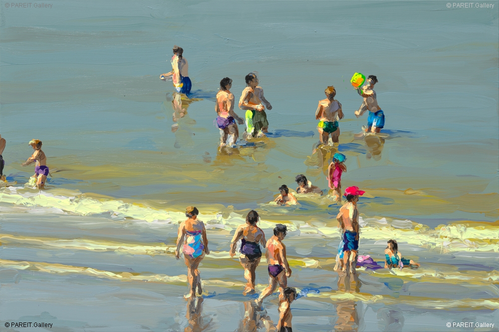 Dans la série " Beach ", Jan De Vliegher part de ses propres photos de la mer, prises depuis la plage, la jetée ou un appartement à Knokke. Les oeuvres respirent une palette bleu clair, dans laquelle des figures humaines apparaissent çà et là ou semblent flâner à travers la surface picturale. C'est l'une des rares séries où la figure humaine occupe un rôle actif -aux côtés de " San Marco ", " Yellow Chairs " et la plus récente " Versailles ". La mer n'y est pas un simple décor statique, mais une surface vivante, vibrante. Par des coups de pinceau énergiques, De Vliegher saisit le mouvement de l'eau et les reflets capricieux de la lumière. Sa fascination pour la manière dont la lumière influence notre perception de la couleur trouve ici toute son expression. Un élément marquant et récent de cette série réside dans les accents subtils de peinture fluo, mis au point par l'artiste lui-même : de petites interventions, mais d'une grande intensité, qui illuminent les images et leur confèrent une vitalité irrésistible. " Les couleurs néon ont la capacité de briller plus intensément que le blanc ", affirme l'artiste. Cet effet se manifeste tout particulièrement dans les vêtements estivaux des baigneurs, où il crée une tension visuelle saisissante : l'oeil est littéralement accroché par cette lueur. Les contrastes se renforcent, et les zones les plus claires semblent presque rayonner. La série " Beach " unit ainsi virtuosité technique et énergie estivale, familière, qui continue de fasciner.