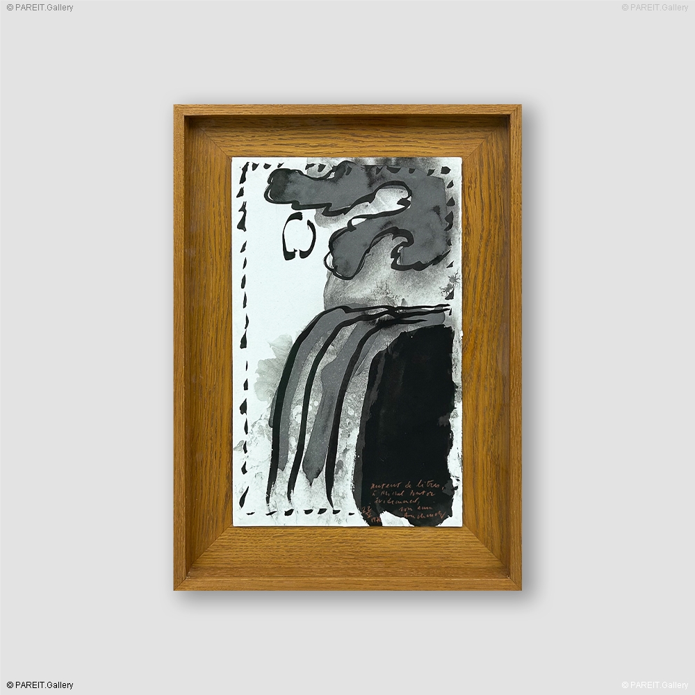 Cette oeuvre, signée datée de mai 1976, illustre une période où Alechinsky a perfectionné ses techniques d'encre et lavis. Le medium est caractéristique de son oeuvre : l'encre produit des lignes nettes et expressives, tandis que le lavis apporte nuances, atmosphère et formes subtilement "flottantes". Elle est dédiée à Michel Butor, auteur impliqué dans plusieurs projets "livre‑art" avec l'artiste. Cette dédicace souligne la relation interdisciplinaire entre littérature et art visuel que développe Alechinsky dans sa pratique. L'oeuvre est présentée avec un fond en chêne foncé et un cadre assorti.