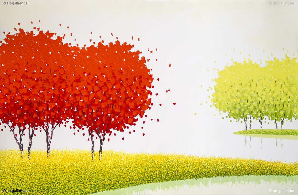 Origineel schilderij van Phan Thu Trang. Het gebruik van frisse pastelkleuren en gecontroleerde bolvormige bomen straalt een zekere "vrolijkheid" van haar schilderijen . Trang's elegante afbeeldingen van landschappen in combinatie met de exclusieve schildertechniek hebben reeds de interesse van internationale kunstverzamelaars opgewekt.