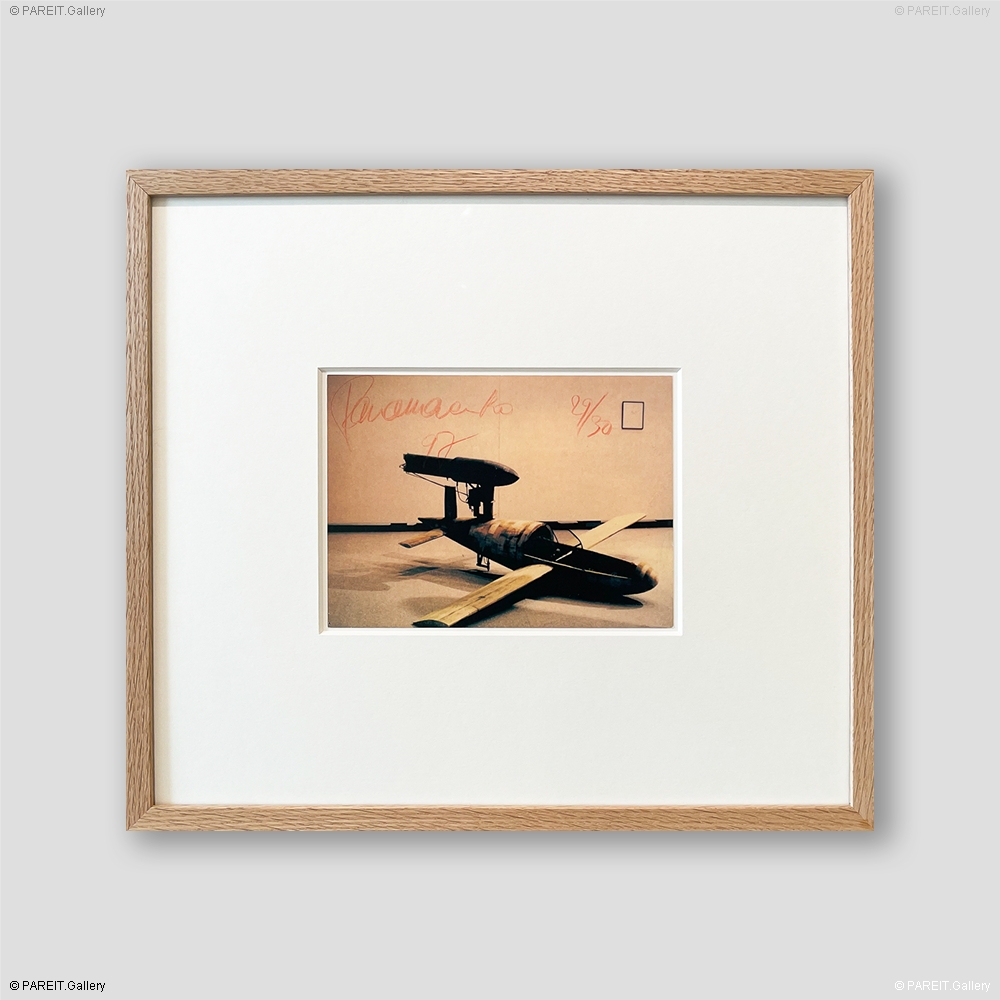 Extra info: Postkaart gesigneerd in viltstift door Panamarenko. De kaart is mooi ingelijst in een houten kader. De kaart is uitgegeven in een beperkte oplage van +- 30 exemplaren.