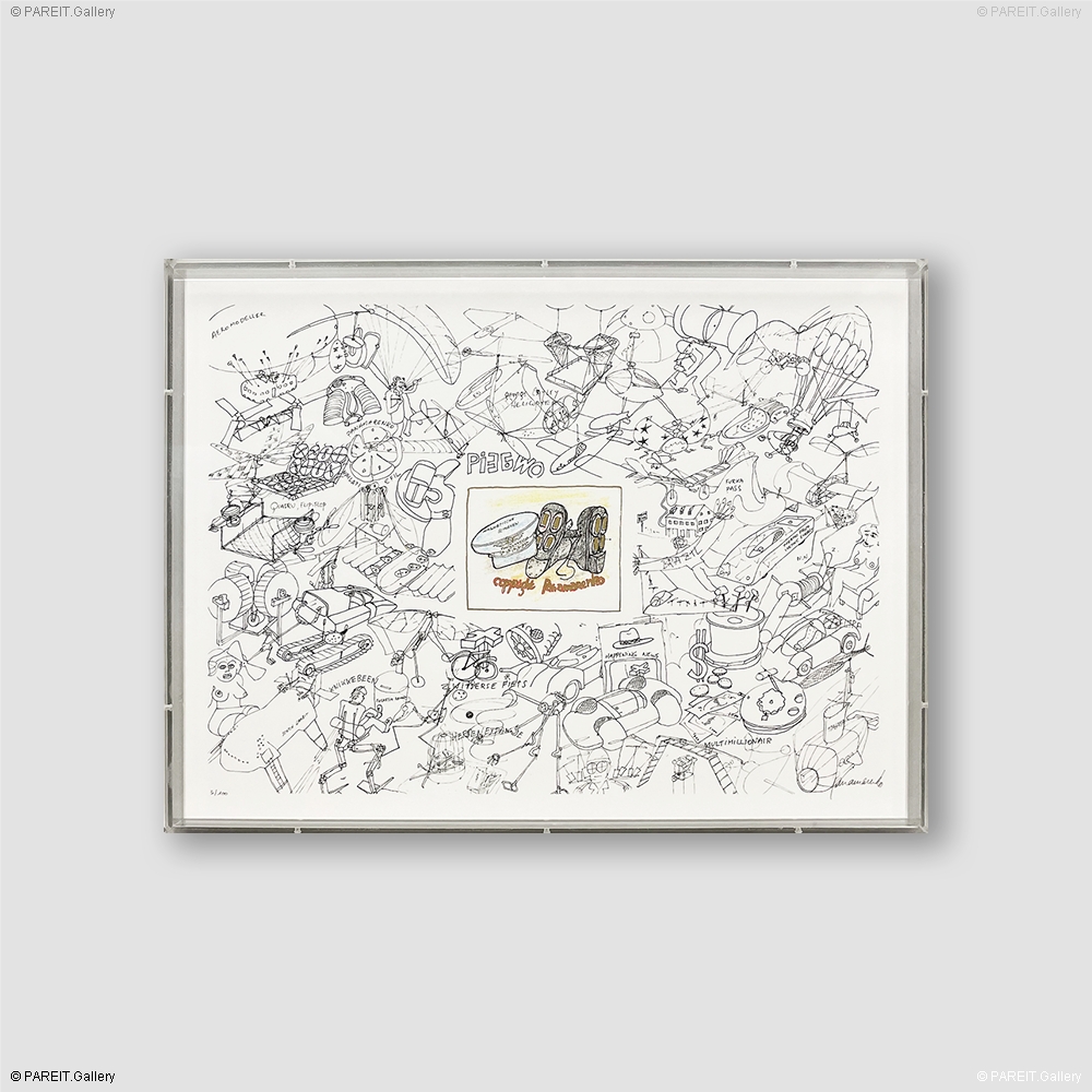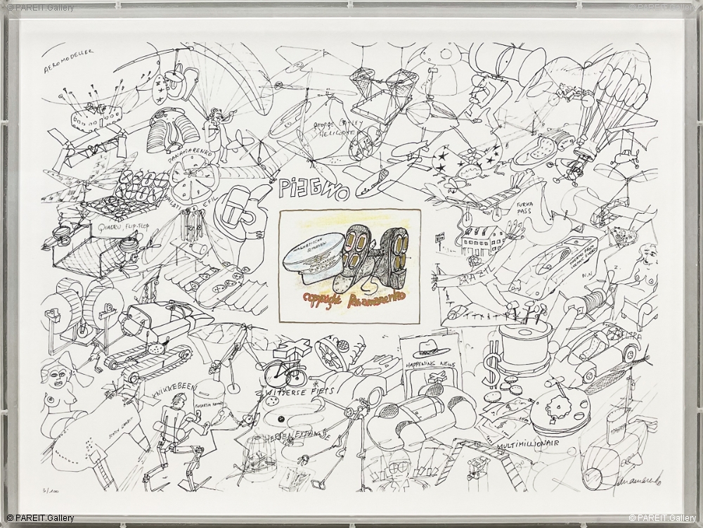 Extra info: Parchtige zeefdruk van Panamarenko, getekend en gesigneerd onderaan het werk op 100 exemplaren. Op dit werk staan alle ontwerpen die beschreven worden in het boek Copyright Panamarenko van Hans Willemense.