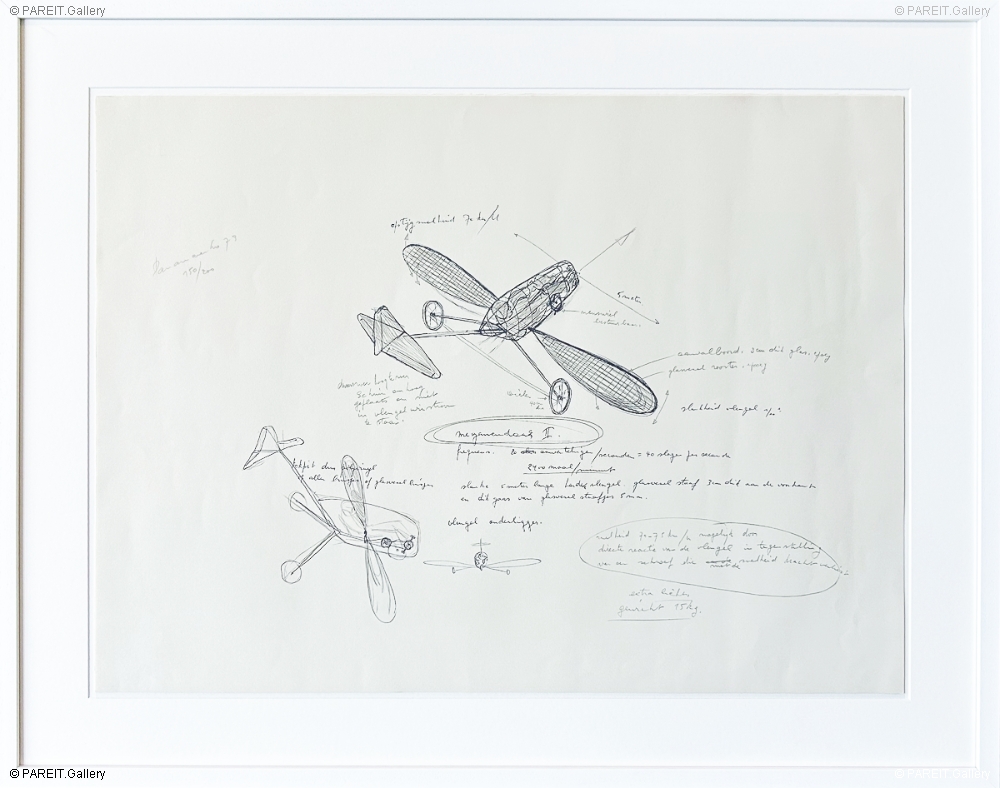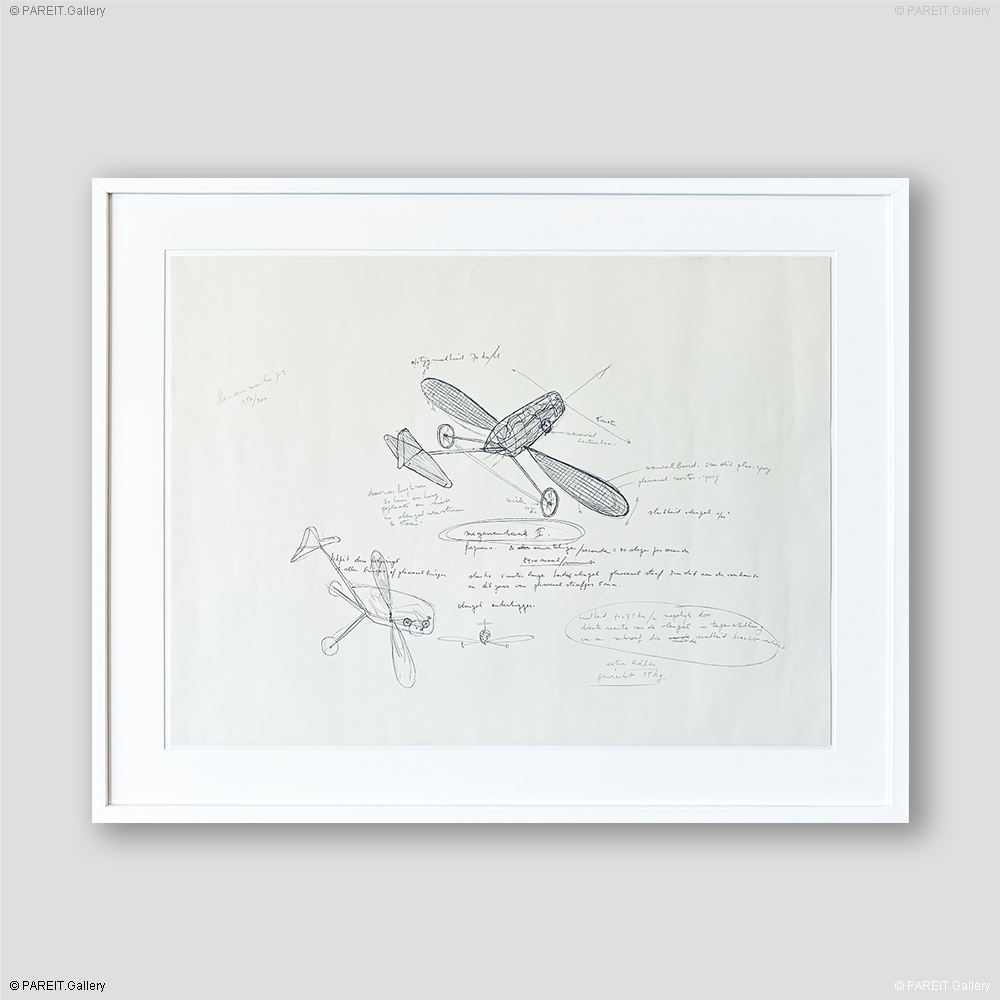 Zeer oude zeefdruk van Panamarenko. Getekend en genummerd op 200 exemplaren. Dit werk is ingelijst in een witte lijst met ontspiegeld glas.