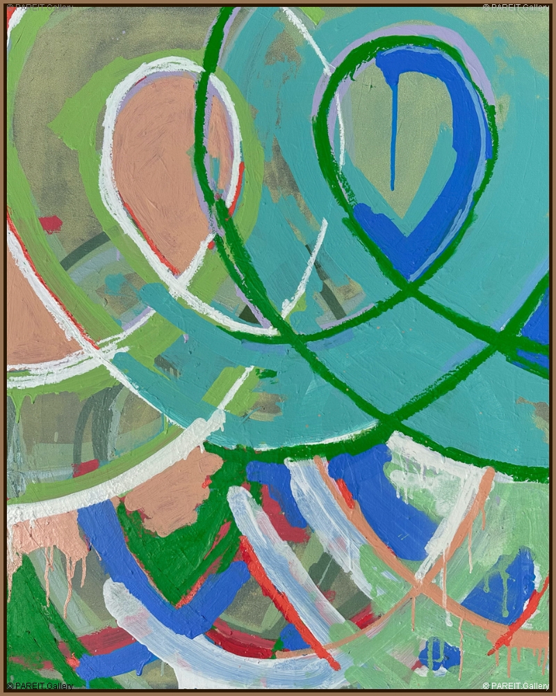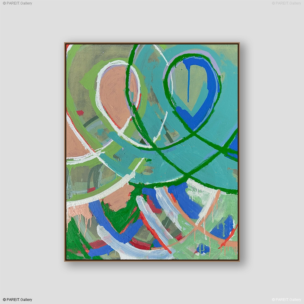 Origineel schilderij op canvas van Piroeh One. Het werk heeft een omlijsting en is klaar om op te hangen. Dit schilderij bevat de gekende Swoons, ellipsvormige cirkels die steeds terugkeren in zijn werk.