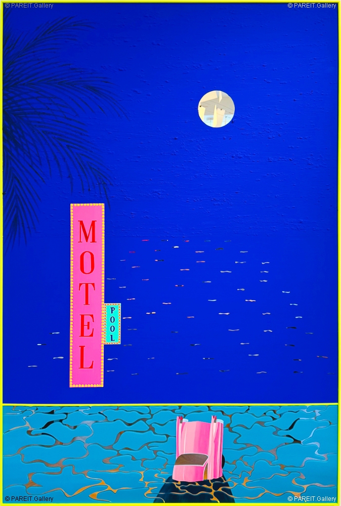 Dit werk maakt deel uit van de reeks Summer Nights (2025), waarin de kunstenaar experimenteert met bichrome composities op een spiegelend oppervlak. De reeks is opgebouwd rond twee kleuren, met als dominante toon het diep verzadigde, gepigmenteerde blauw van Yves Klein. De serie-titel Summer Nights verwijst zowel naar zwoele, mysterieuze nachten in verre oorden als naar het bevreemde gevoel van desoriëntatie bij aankomst op onbekende plaatsen. Die sfeer wordt versterkt door invloeden uit de vintage cinema - denk aan de suggestieve werelden van David Lynch, Quentin Tarantino of Tim Burton. Het werk bevat een lichte omlijsting in geschilderd hout en is uitgevoerd in acrylverf op plexi-spiegel, waardoor het beeld letterlijk en figuurlijk wordt weerspiegeld.
