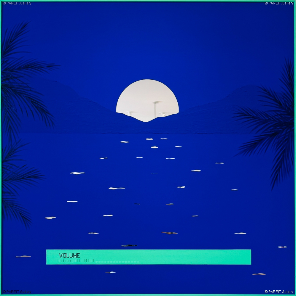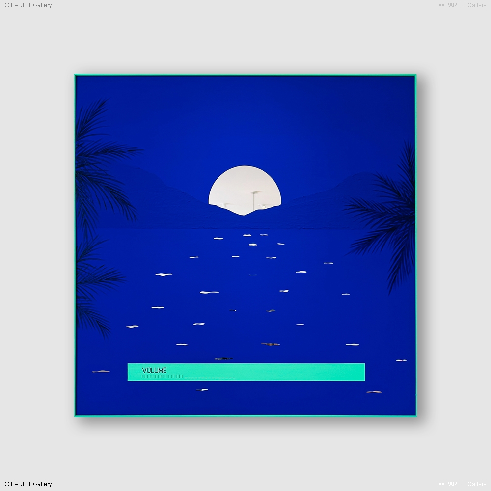Dit werk maakt deel uit van de reeks Summer Nights (2025), waarin de kunstenaar experimenteert met bichrome composities op een spiegelend oppervlak. De reeks is opgebouwd rond twee kleuren, met als dominante toon het diep verzadigde, gepigmenteerde blauw van Yves Klein. De serie-titel Summer Nights verwijst zowel naar zwoele, mysterieuze nachten in verre oorden als naar het bevreemde gevoel van desoriëntatie bij aankomst op onbekende plaatsen. Die sfeer wordt versterkt door invloeden uit de vintage cinema - denk aan de suggestieve werelden van David Lynch, Quentin Tarantino of Tim Burton. Het werk bevat een lichte omlijsting in geschilderd hout en is uitgevoerd in acrylverf op plexi-spiegel, waardoor het beeld letterlijk en figuurlijk wordt weerspiegeld.