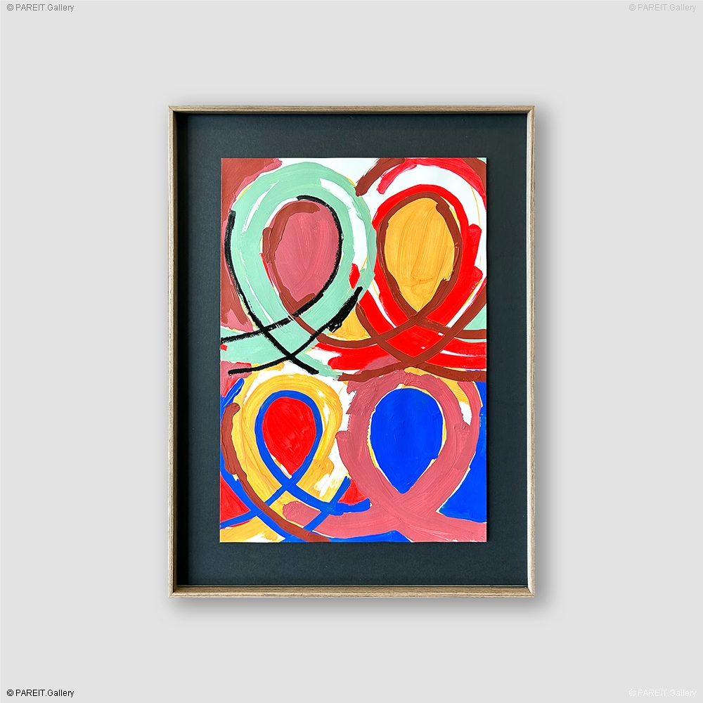 Origineel en uniek schilderij op papier. Het werk is ingelijst in een fijne houten lijst, voorzien van UV-werend glas en volledig klaar om op te hangen. Kenmerkend zijn de herkenbare "Swoons": ellipsvormige cirkels die telkens opnieuw in Piroeh One's werk verschijnen.