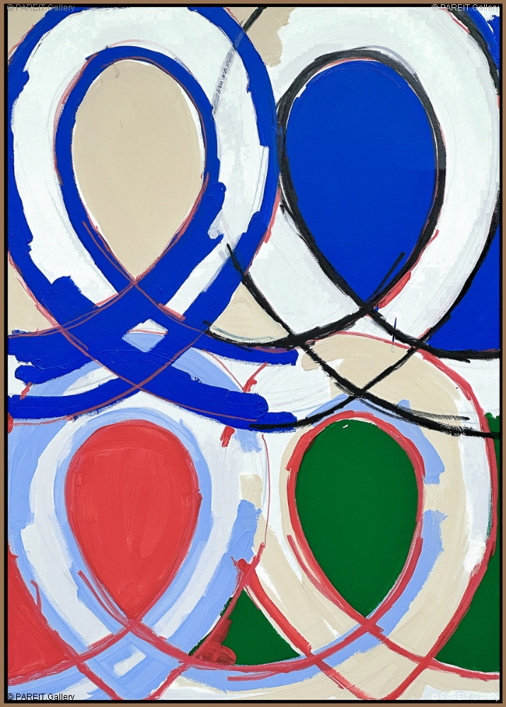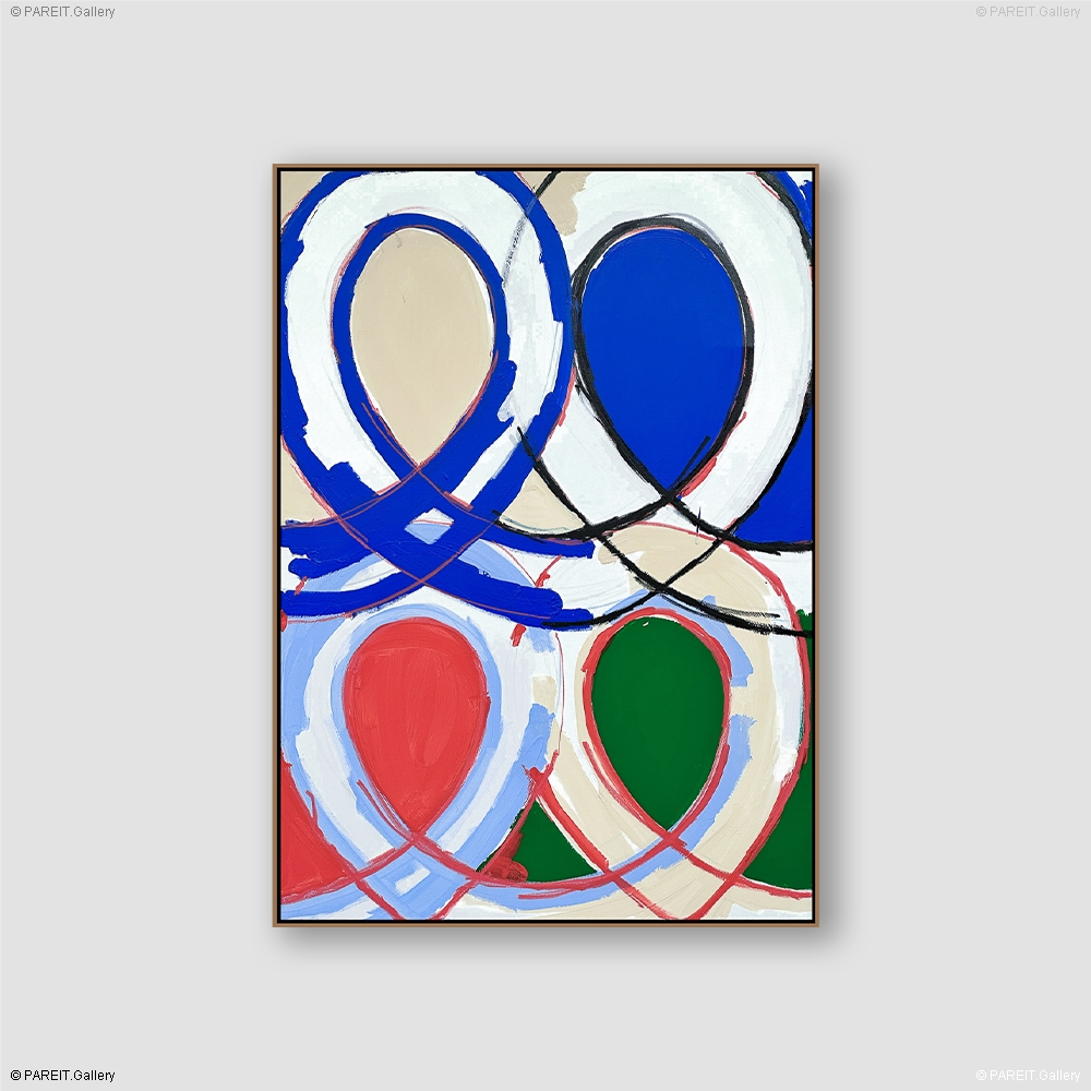 Origineel schilderij op canvas van Piroeh One, afgewerkt met een smalle houten lijst en klaar om op te hangen. Het werk toont de kenmerkende "Swoons" van de kunstenaar: kleurrijke ellipsvormige cirkels die emotionele intensiteit en ritme uitstralen. Gesigneerd op de achterkant.
