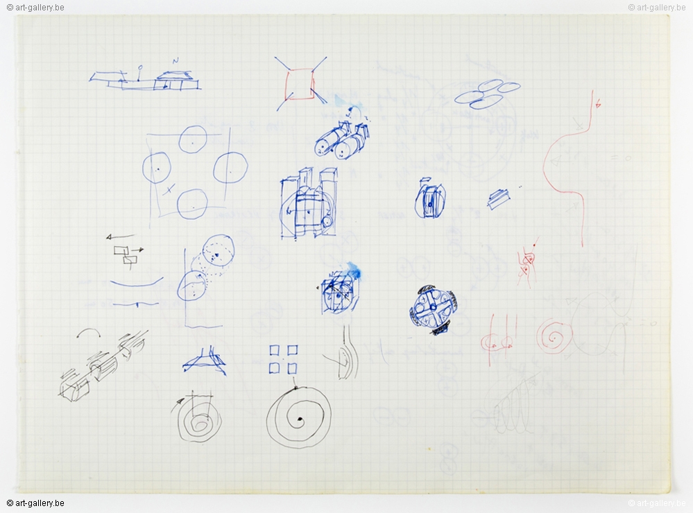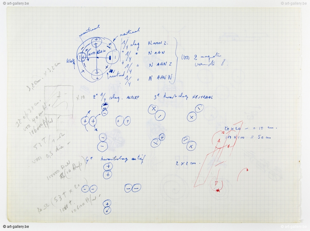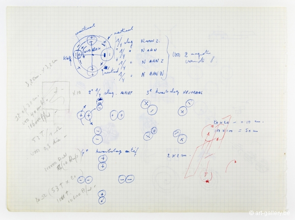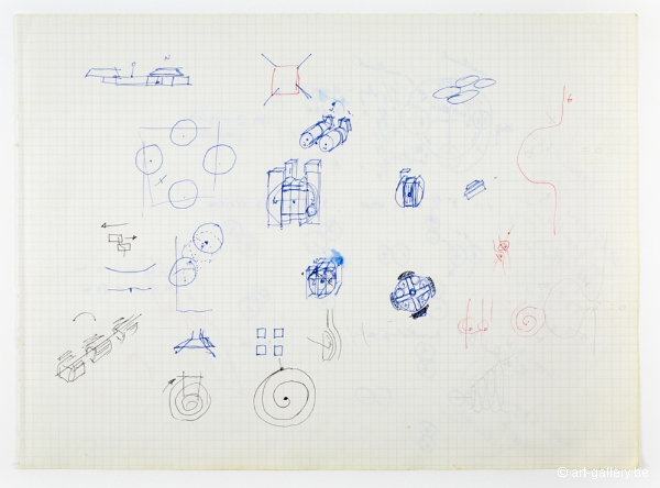 A special, unique page from a 1982 sketchbook by Panamarenko. The sketchbook has the caption "Keep the opposing poles in balance and lift the machine" of which a book will be published in mid-2020 on the occasion of Panamarenko's 80th birthday. This drawing is included in the book.