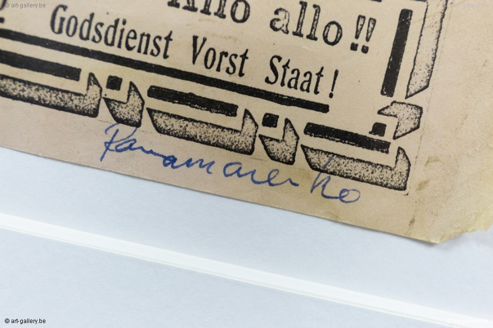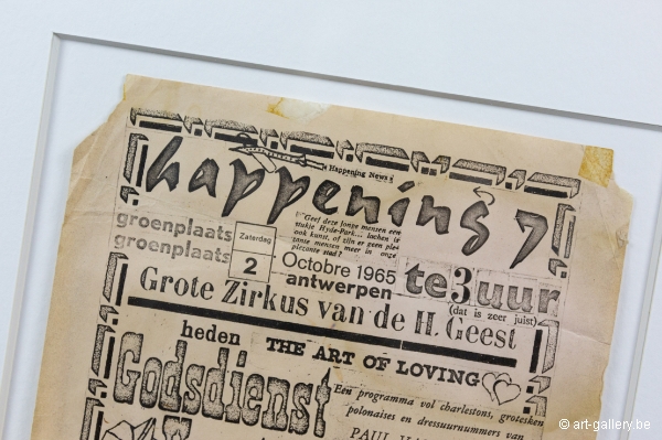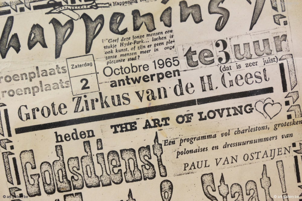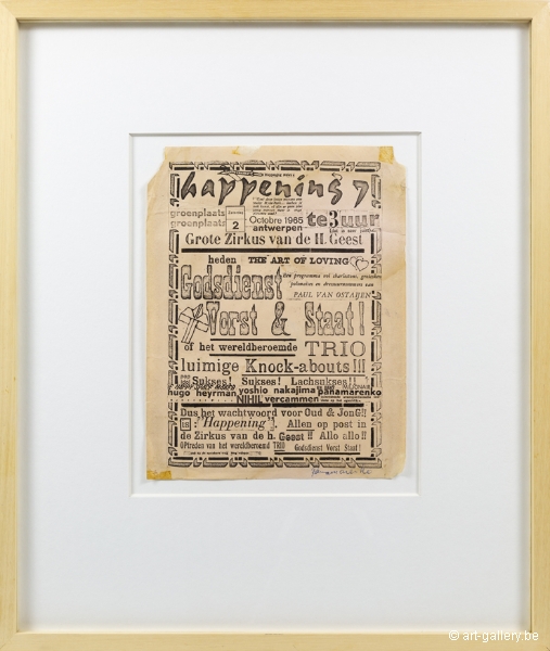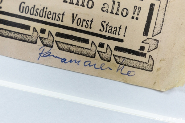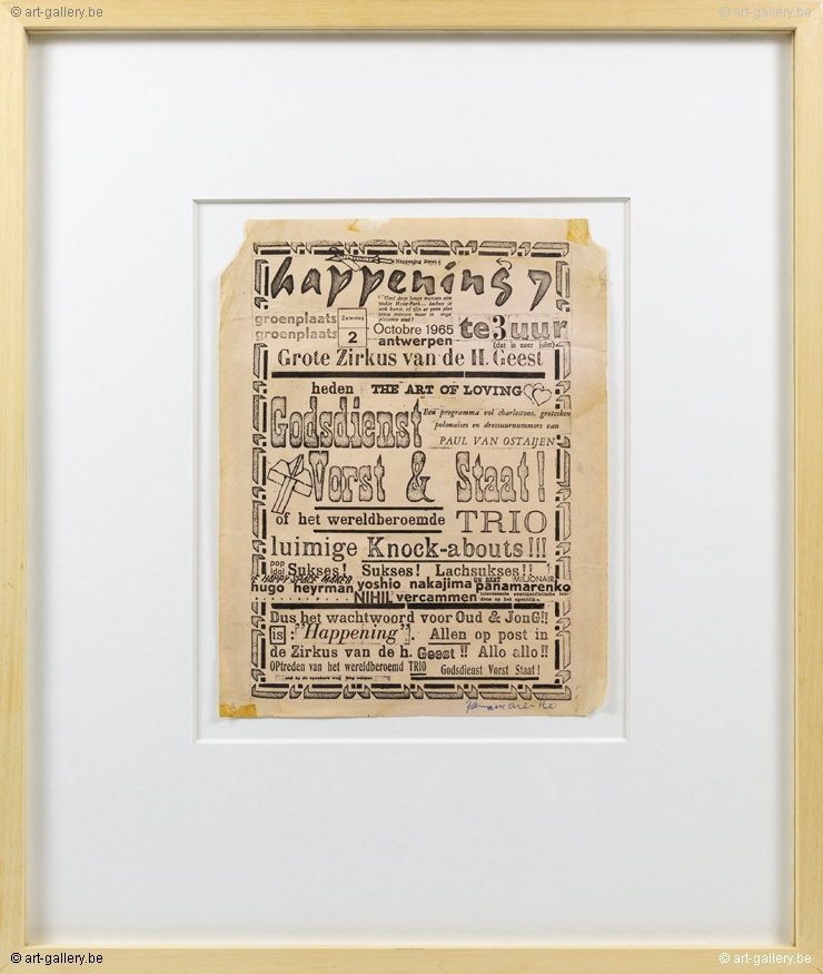 Unique print signed by Panamarenko. This is a museum piece shown in the Marta Herford museum. This work comes from Jan Hoet. This is an announcement of a Happening at the Groenplaats in Antwerp.