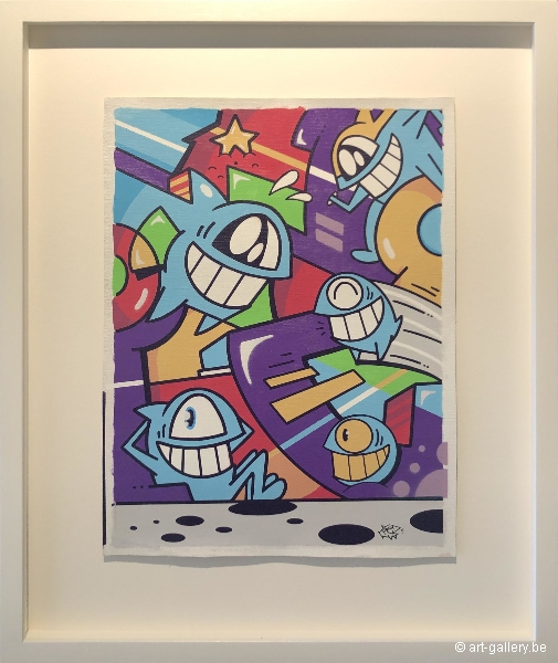 Original painting on canvas by El Pez Barcelona. The work is framed in a frame with anti-reflective museum glass. The size including the frame is 57cm x 47cm.