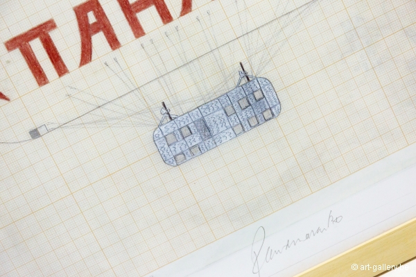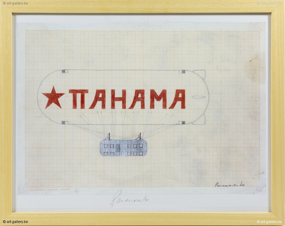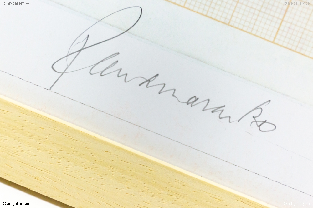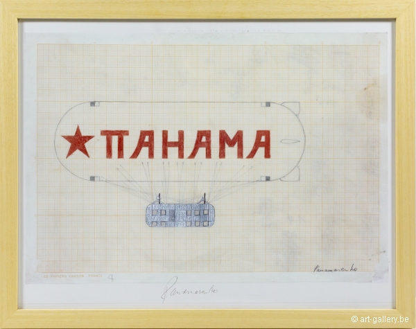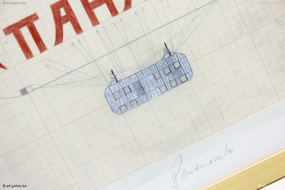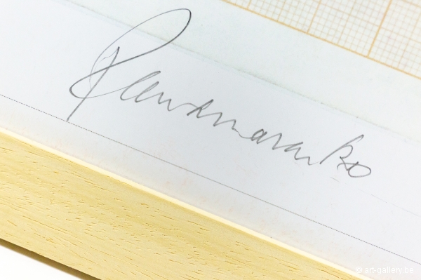 Hand-signed page from the 2004 calendar. The calendar was set by gallery Ronny Van de Velde. Only a few of these were hand-signed by Panamarenko. The work is framed in a wooden frame. Dimensions of the frame are 56cm x 44cm.