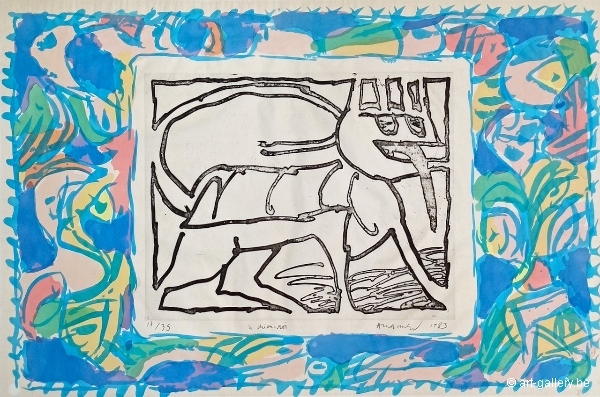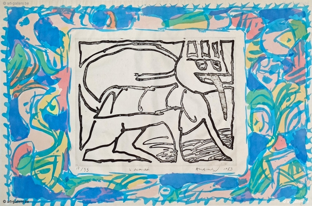 Pierre Alechinsky: "Le chien roi". Signed Alechinsky 1983, 19/35. Aquatinte and pochoir on Japan paper. Sheet size 95,5×64 cm.