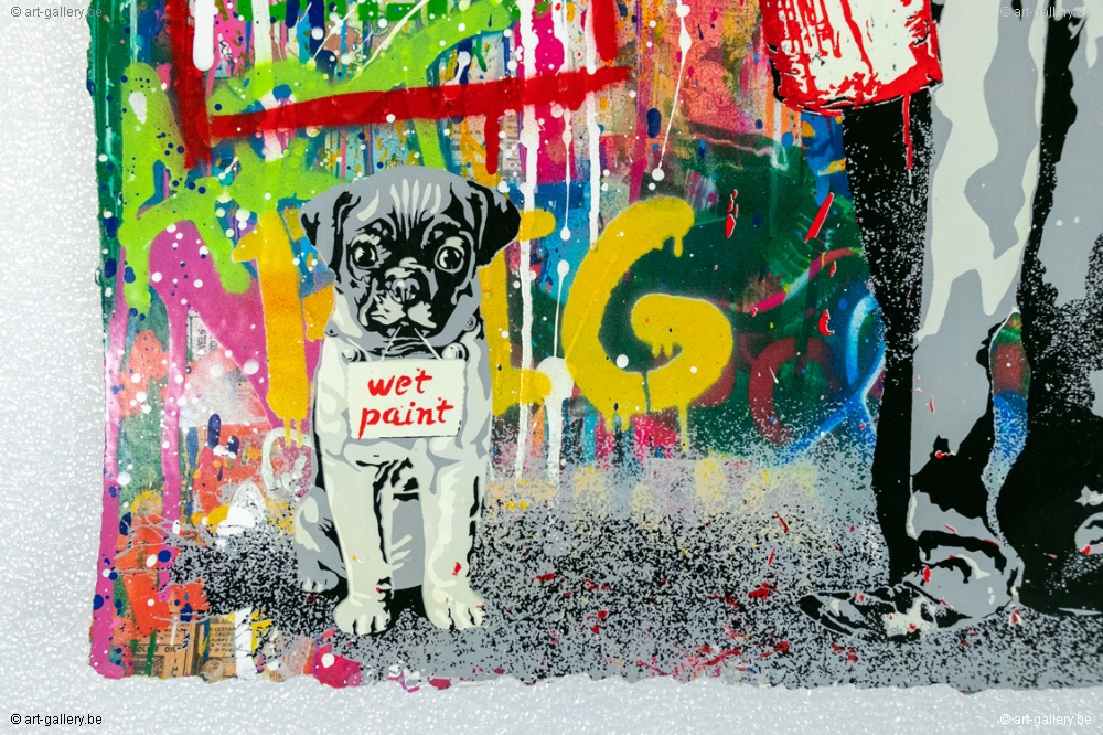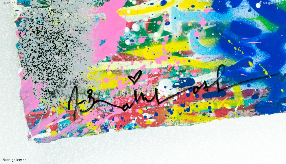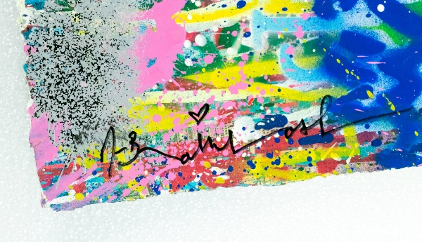 Mixed media with acrylic paint and stencil graffiti on paper. Signed by hand by the artist.
