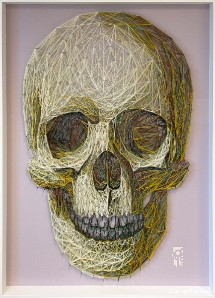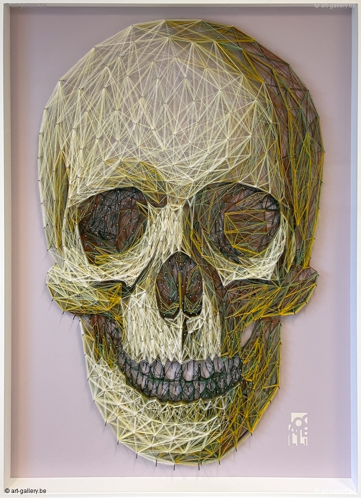 Extra info: Original string skull artwork by Steve Locatelli. The work is mounted behind anti-reflective museum glass and has a signature. The skull was composed of nails that were constructed in the shape of a skull. Afterwards, the nails were connected with wires to create a beautiful 3D effect. According to Steve, a skull is so universal that you can't tell whether it was a boy or a girl or whether it was a white, African or Chinese person. We are all the same!
