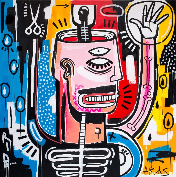 Spray paint, acrylic, paint markers Acquired from Huberty Bryne Gallery The painting is very large and has an impressive presence to it. Currently stretched but most likely be easier to ship the work unstretched and rolled.