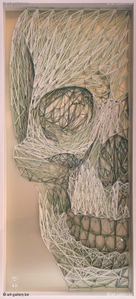 Extra info: Original string skull artwork by Steve Locatelli. The work is mounted behind anti-reflective museum glass and has a signature. The skull was composed of nails that were constructed in the shape of a skull. Afterwards, the nails were connected with wires to create a beautiful 3D effect. According to Steve, a skull is so universal that you can't tell whether it was a boy or a girl or whether it was a white, African or Chinese person. We are all the same!