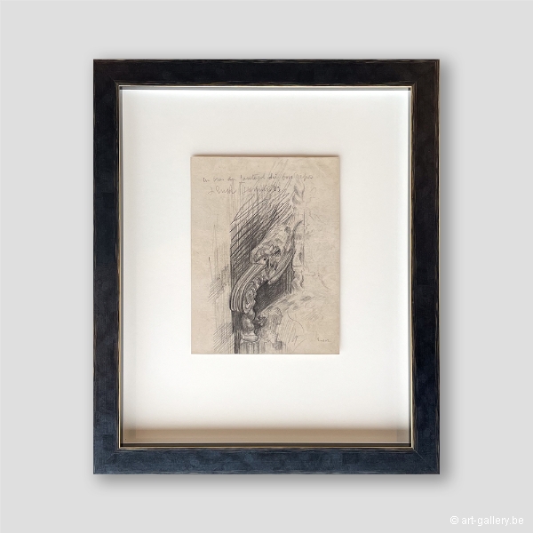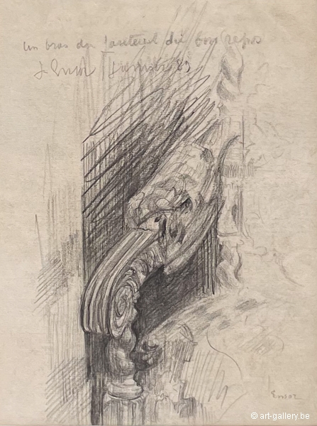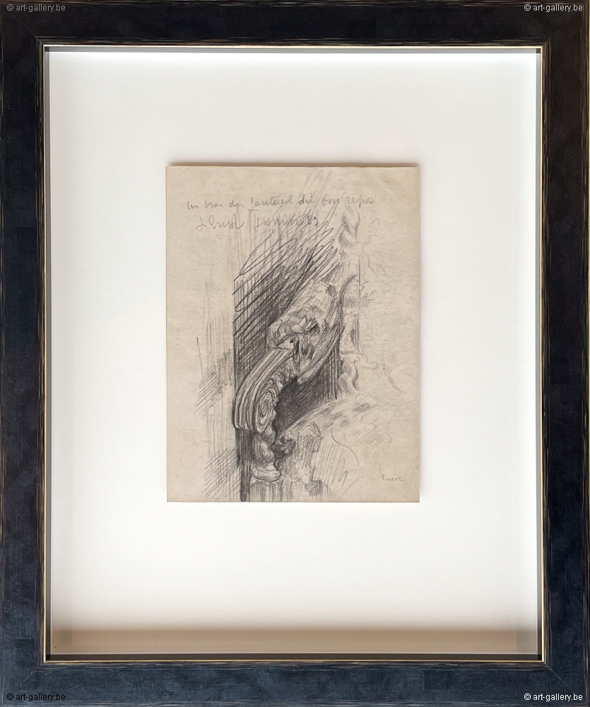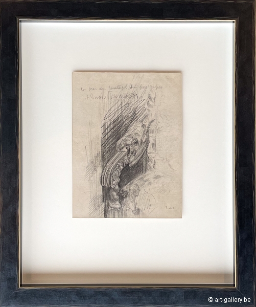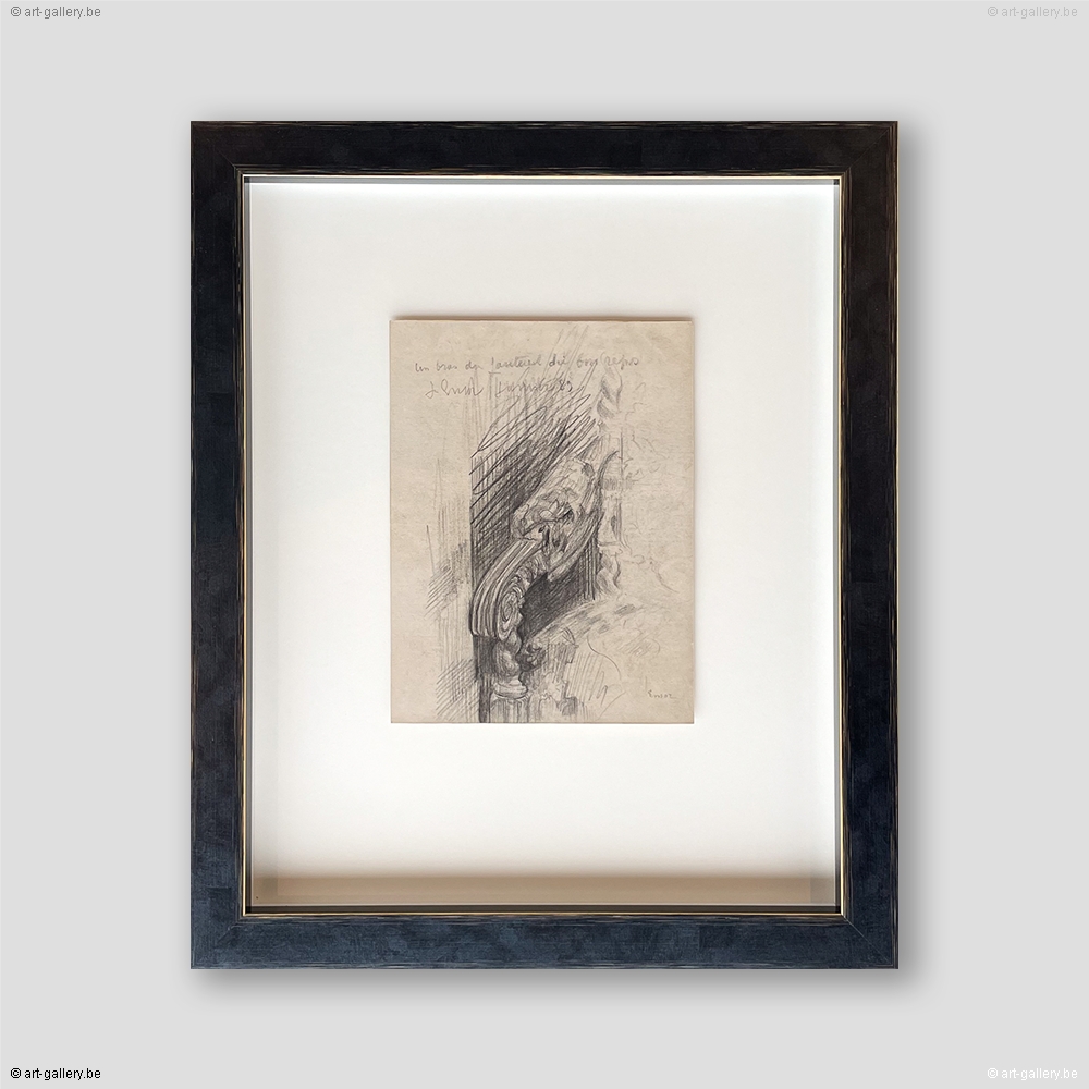 Extra info: Un bras du fauteuil du bureau is an original drawing on paper by James Ensor. This drawing, made in 1889, serves as a preliminary study for an office chair back that would later be incorporated into his paintings. The drawing is exceptionally detailed and shows Ensor's masterful skill in capturing the finest nuances. This work offers a fascinating insight into Ensor's creative process and his attention to detail. The work is framed in a white frame with anti-reflective UV-resistant glass.