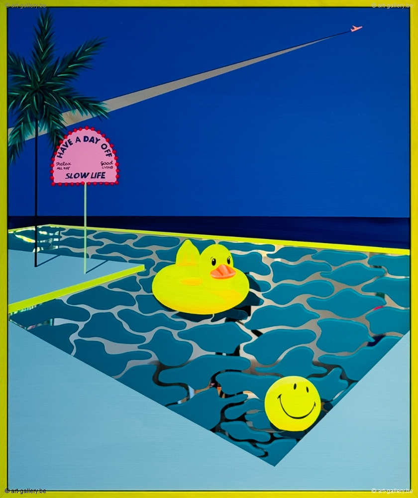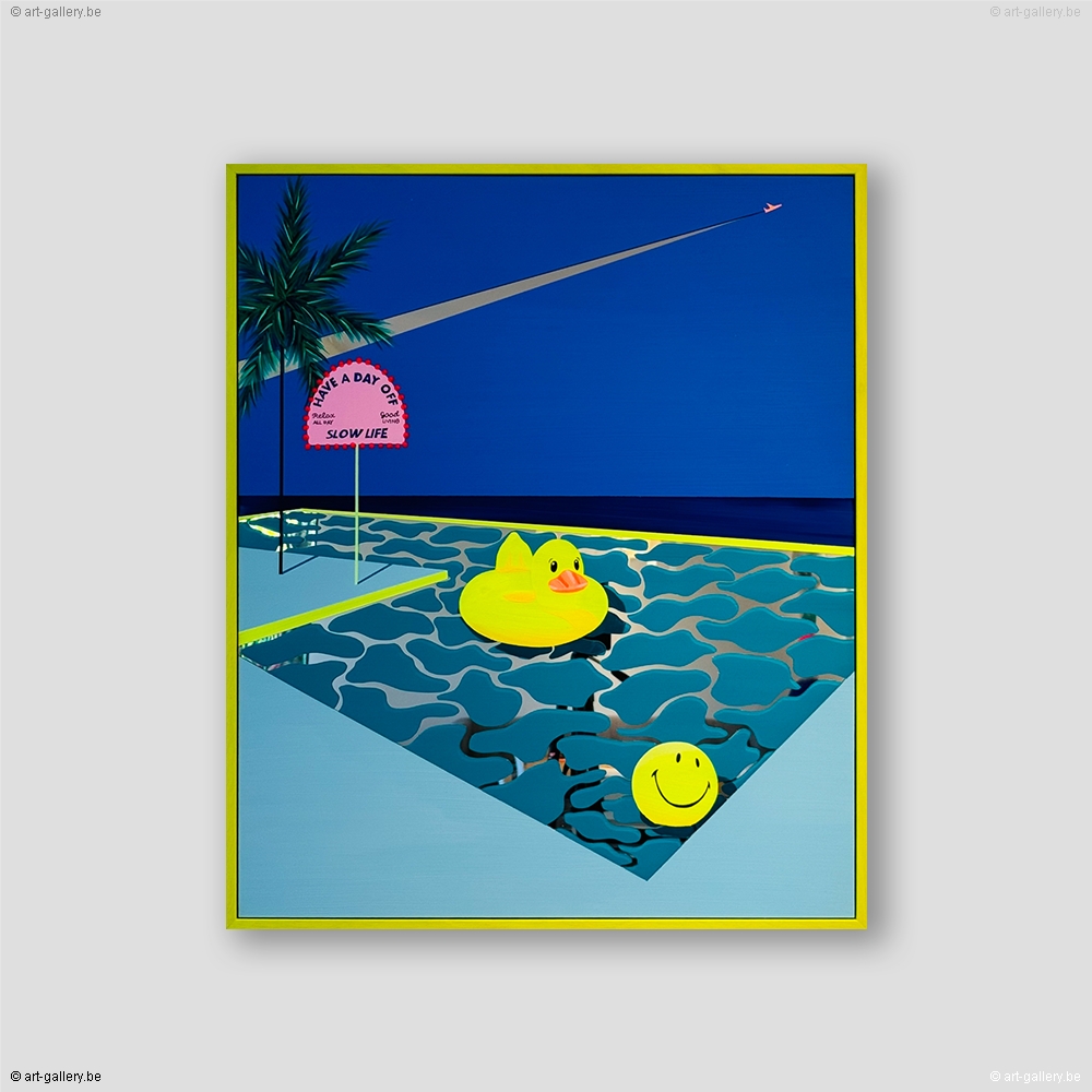 Original acrylic painting on Plexi mirror. The work is framed by a light wood frame. Without knowing where we are, nor without knowing what will happen next, we find ourselves in mysteriously colorful places. Calm, serene spaces that seem lost in time and devoid of life. And yet... Then a movement arises and the mirror surfaces begin to animate the paintings thanks to the reflections of the light.