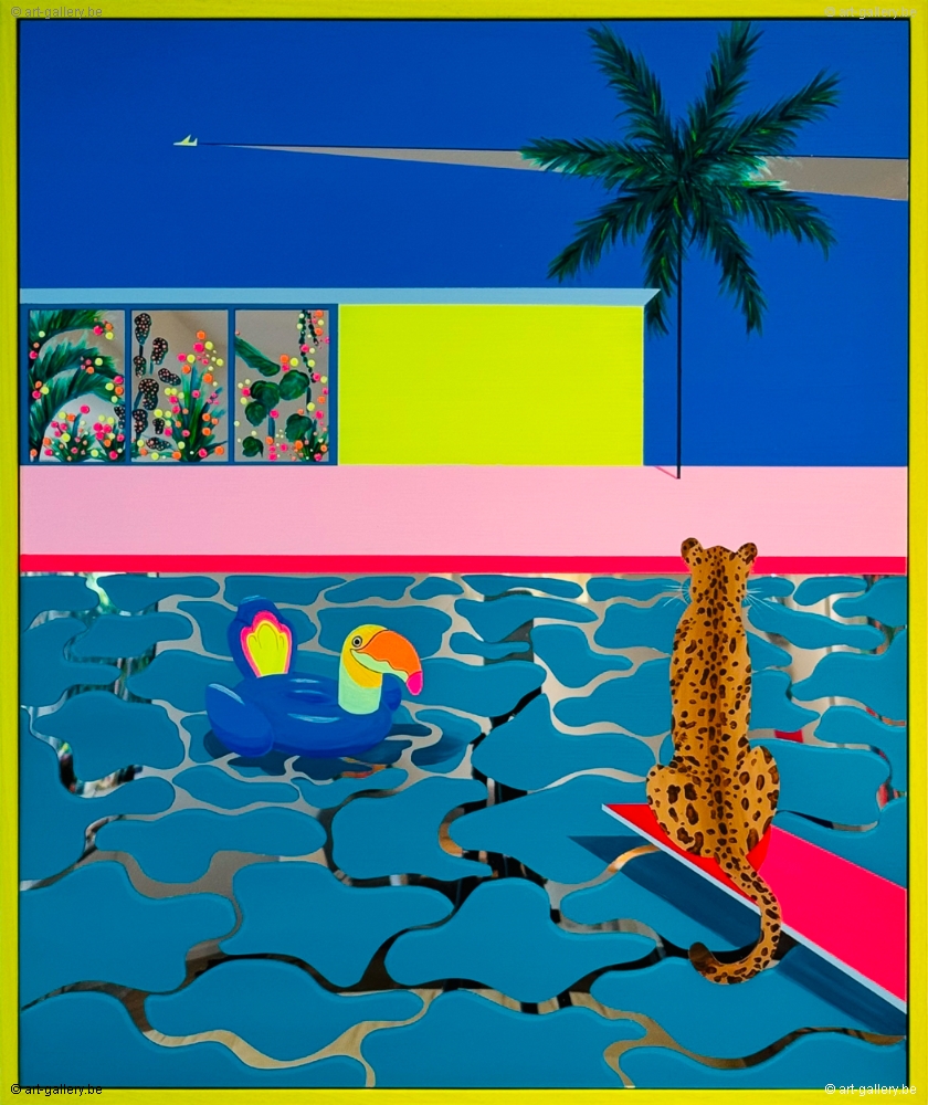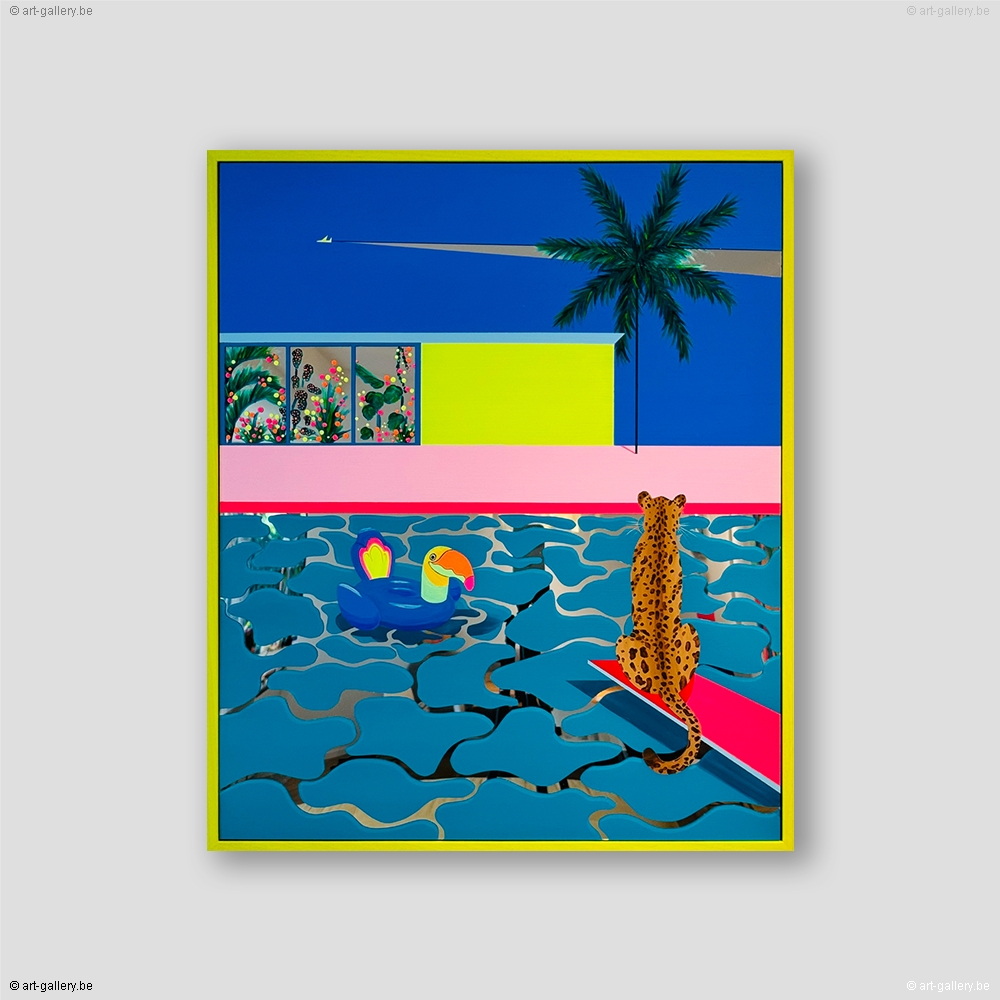 Extra info: Original acrylic painting on Plexi mirror. The work is framed by a light wood frame. Without knowing where we are, nor without knowing what will happen next, we find ourselves in mysteriously colorful places. Calm, serene spaces that seem lost in time and devoid of life. And yet... Then a movement arises and the mirror surfaces begin to animate the paintings thanks to the reflections of the light.
