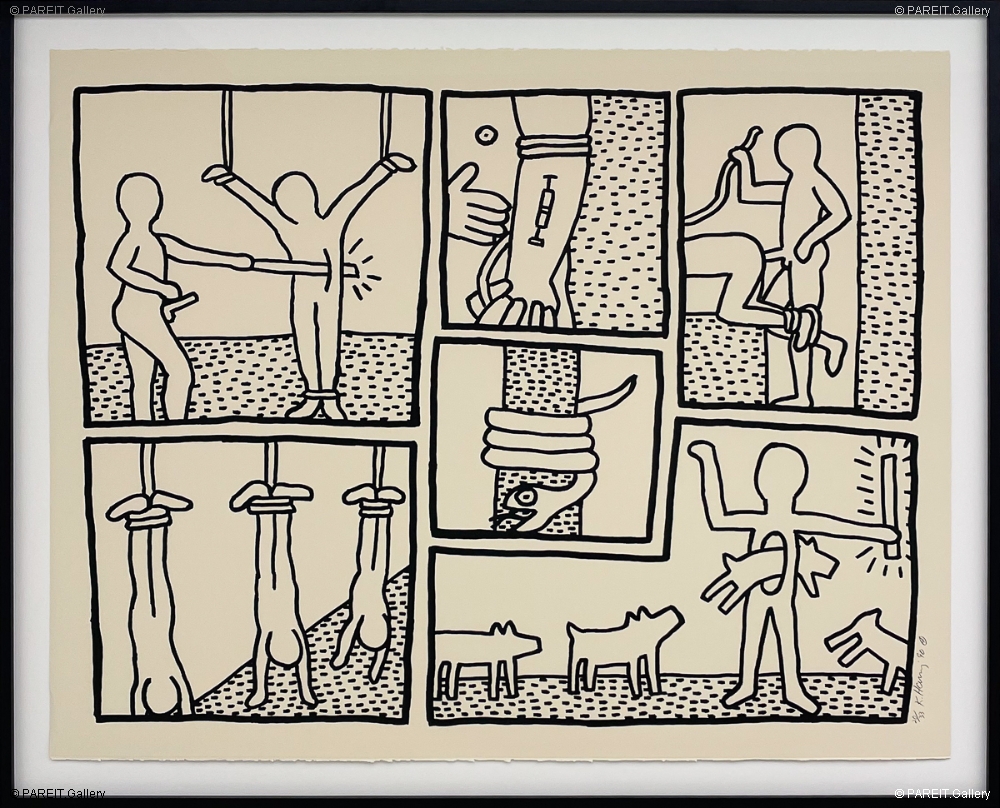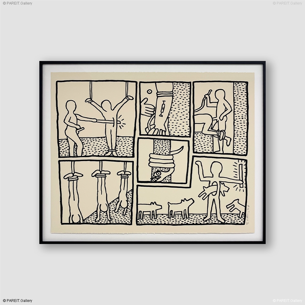 Hand-signed and numbered screen print, limited to just 33 copies. This exceptional piece is featured in the prestigious book Keith Haring: Editions On Paper 1982-1990. The screen print is elegantly framed in a black frame with anti-reflective museum glass, ensuring optimal presentation and protection.