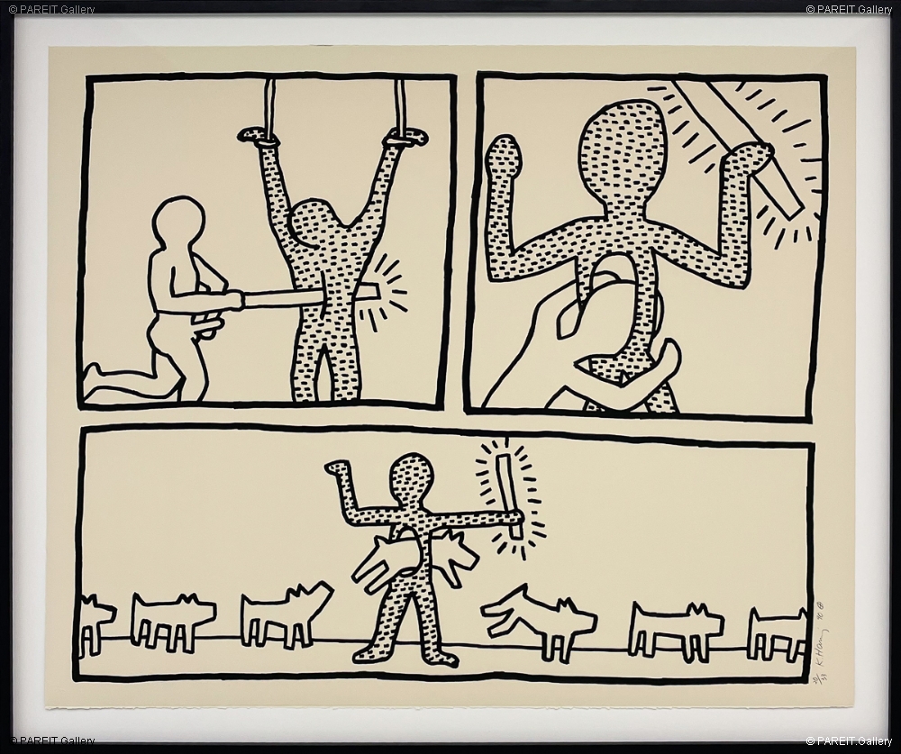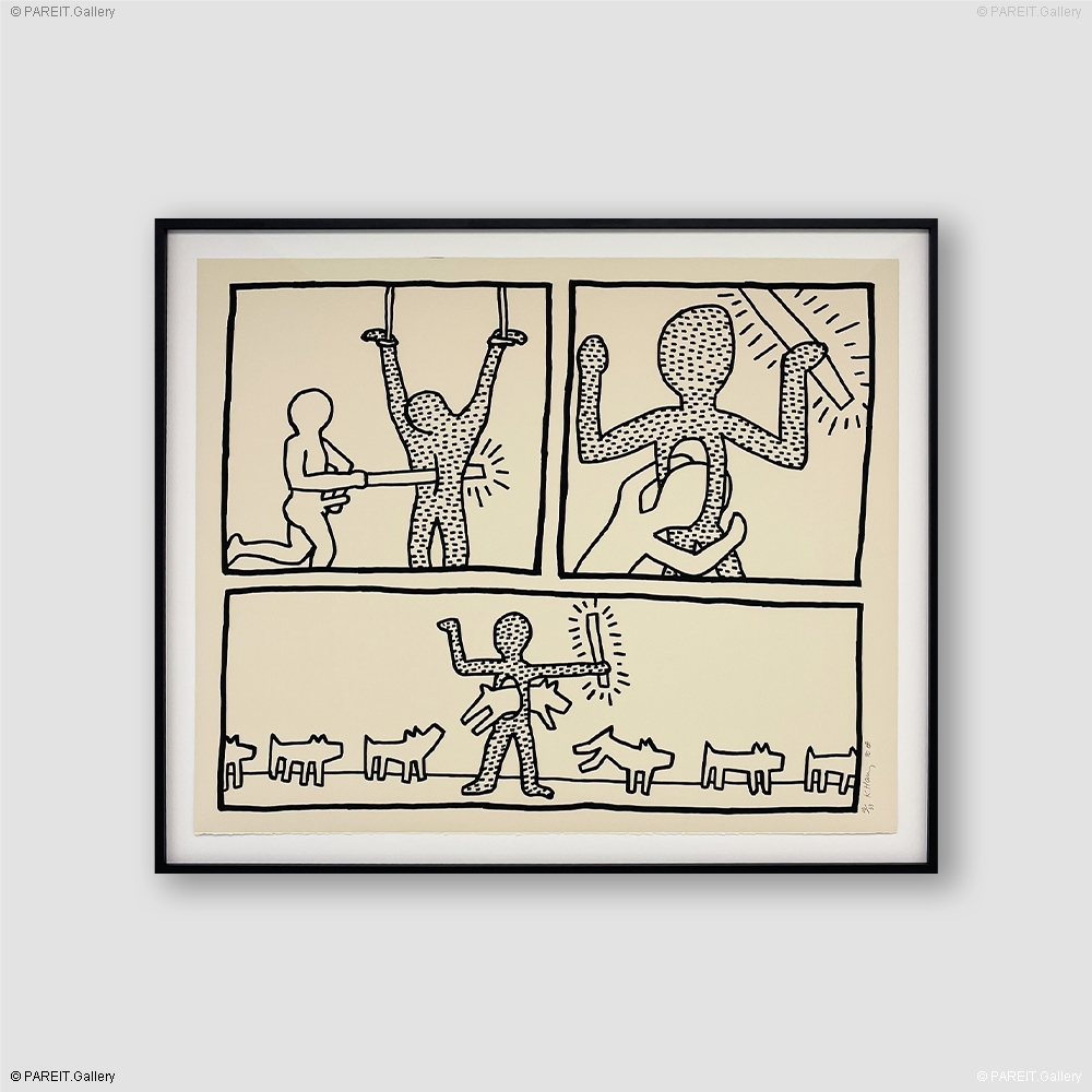 The Blueprint Drawings 9 unfolds across three bold panels, reminiscent of a graphic novel. In this work, Keith Haring explores themes of identity, sexuality, marginalization, and mortality through his distinctive visual language. With a direct yet layered approach, he invites viewers into a narrative that blends personal expression with broader social commentary.