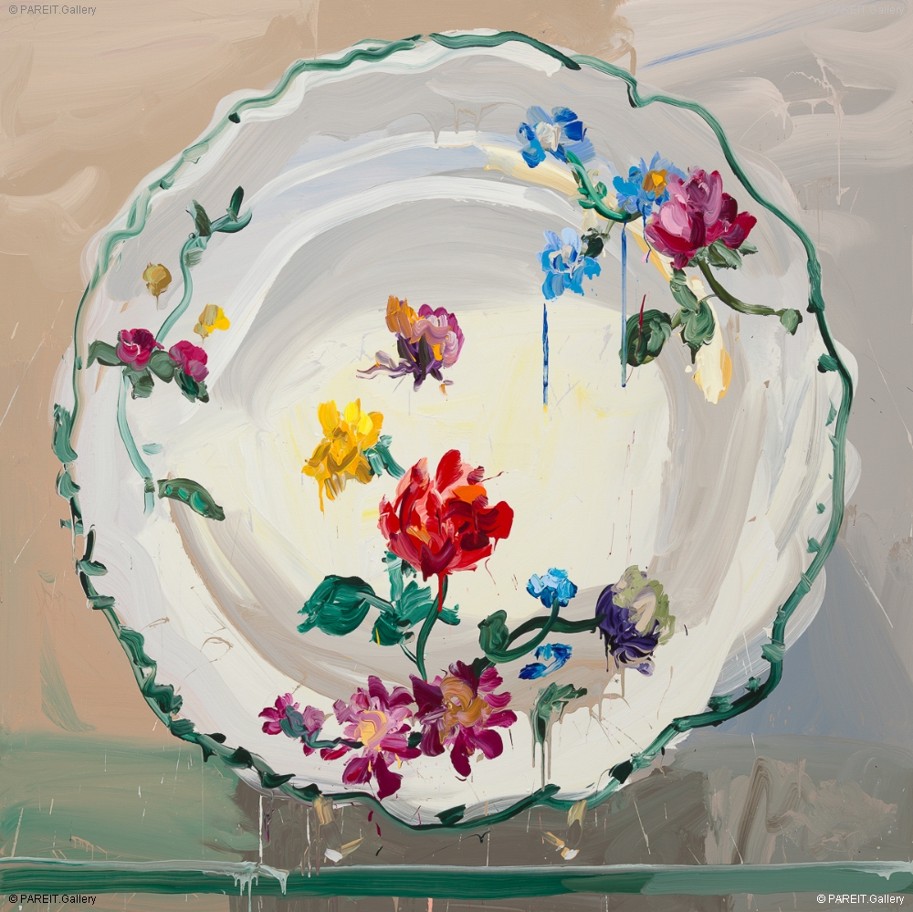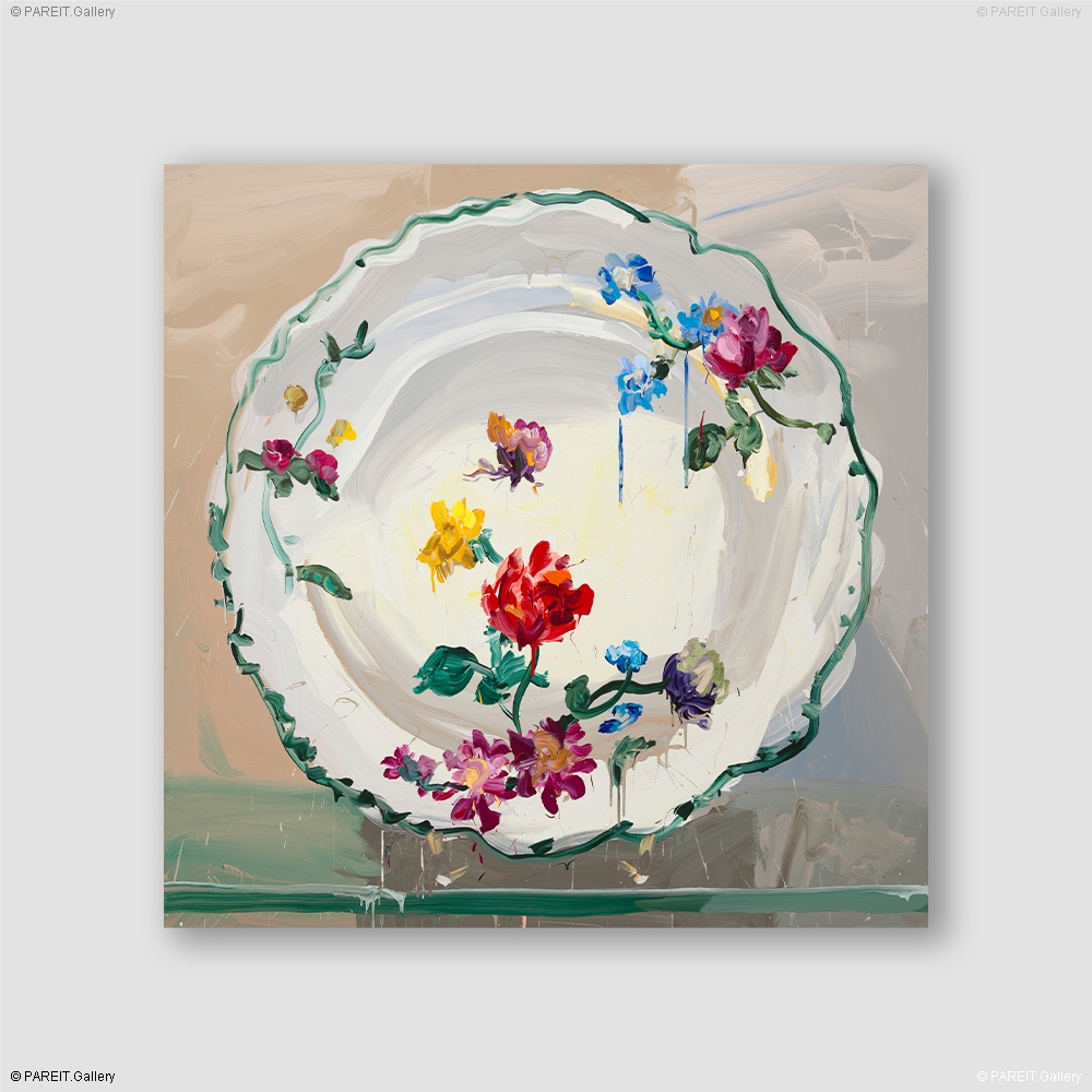 Porcelain was once the ultimate status symbol: a precious object reflecting the taste, wealth, and worldly outlook of its owners. Today, it carries above all a memory -of grandeur, refinement, and a vanished form of material culture. In that visual and cultural legacy, Jan De Vliegher finds a lasting source of inspiration. In the "Plates" series, he transforms porcelain dishes into abstracted visions: not faithful depictions of reality, but expressive interpretations -freer, richer, more intense. Each plate becomes a visual manifesto: a circular explosion of colour and movement set against a neutral background. The series reflects on the human tendency to surround oneself with beauty and opulence, as the European aristocracy once did. What was once a utilitarian object is, under De Vliegher's brush, lifted beyond its function -elevated to idea, to desire. That "Plates" ranks among the artist's personal favourites underscores the significance he attaches to this body of work. Each piece turns the plate into an open field of colour, gesture, and paint -a celebration of painting itself.