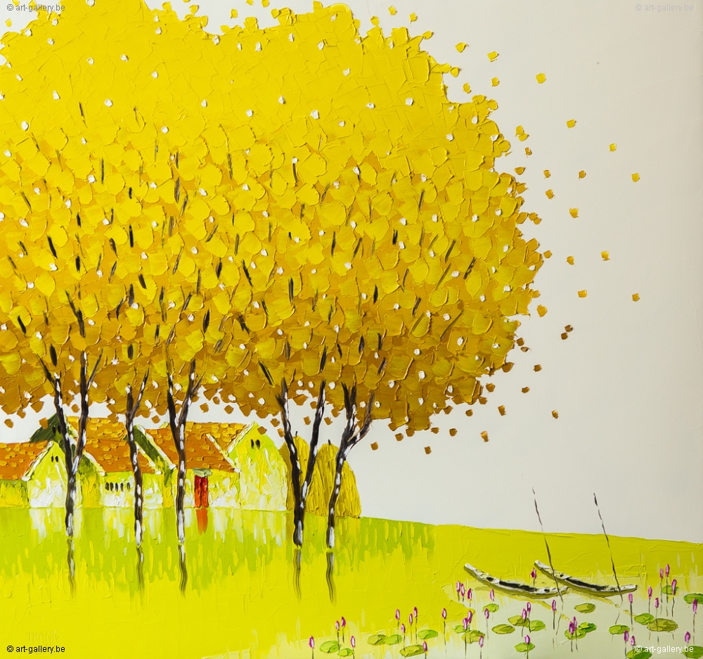Peinture originale par Phan Thu Trang . L'utilisation de couleurs vives et pastel et des arbres sphériques contrôlées dégage une certaine " joie " de ses peintures . Images élégantes de Trang de paysages combinées avec les techniques exclusives de peinture ont déjà suscité l'intérêt des collectionneurs d'art internationaux .